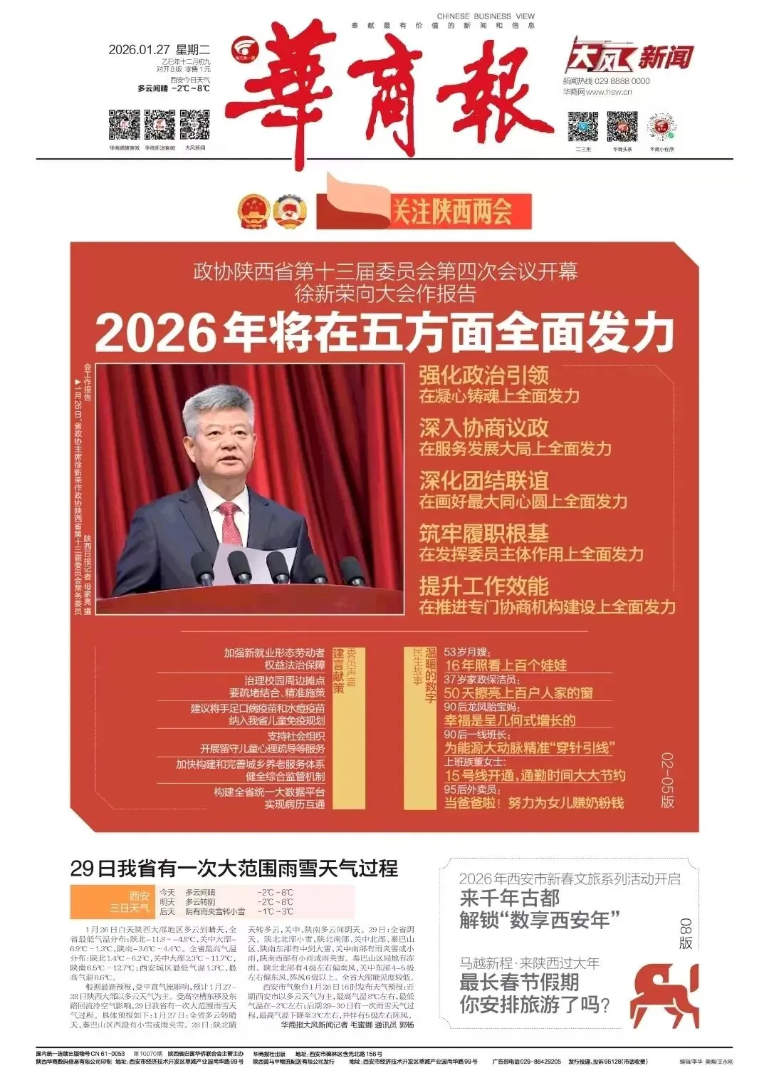 ▲ 1月26日上午,政协陕西省第十三届委员会第四次会议在西安开幕。陕西省政协主席徐新荣代表政协陕西省第十三届委员会常务委员会向大会作报告。