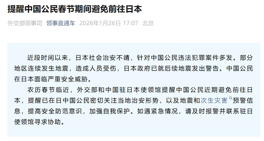 ▲26日,外交部领事司提醒中国公民春节期间避免前往日本。
