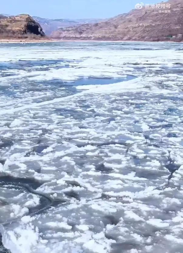 ▲近日,受持续降温影响,大量流凌顺流而下,在壶口瀑布下游形成流凌封河景观。