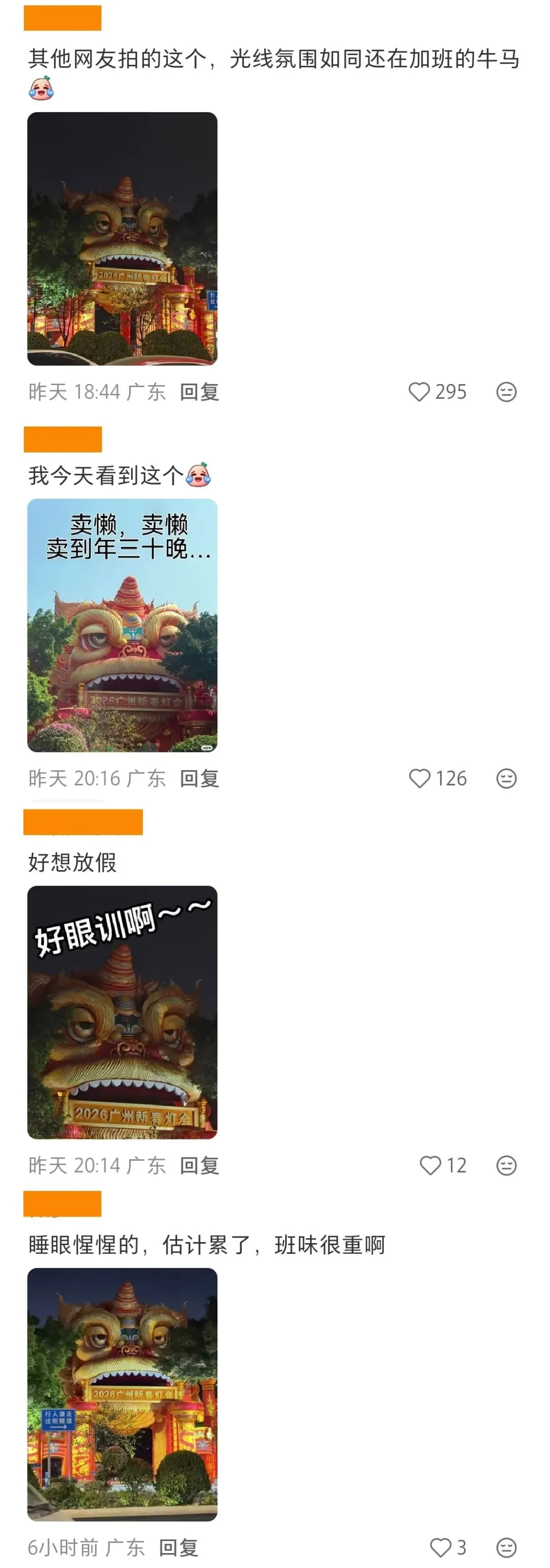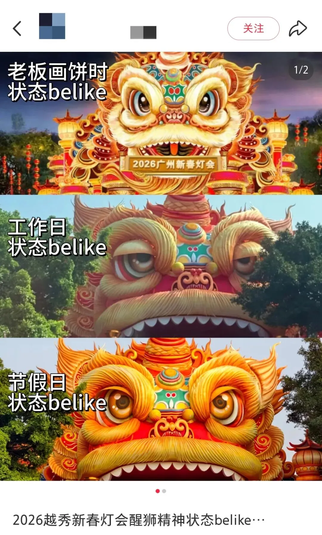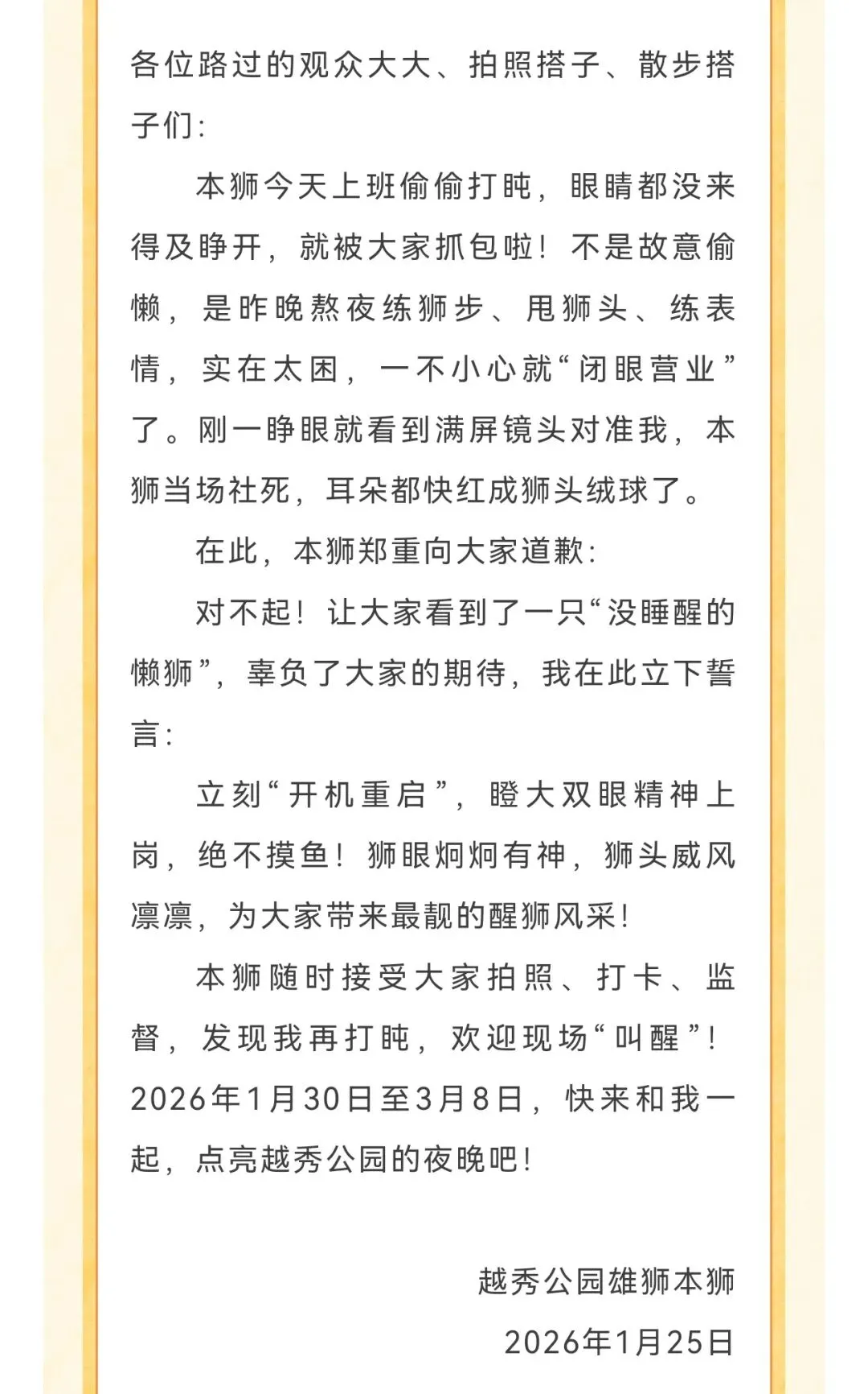 1月25日,越秀公园官微以“越秀公园雄狮本狮”的名义发布了《越秀公园醒狮灯组上岗宣言》,其中写道:“本狮今天上班偷偷打盹,眼睛都没来得及睁开,就被大家抓包啦!不是故意偷懒,是昨晚熬夜练狮步、甩狮头、练表情,实在太困,一不小心就‘闭眼营业’了。刚一睁眼就看到满屏镜头对准我,本狮当场社死,耳朵都快红成狮头绒球了……在此,本狮郑重向大家道歉:对不起!让大家看到了一只‘没睡醒的懒狮’......我在此立下誓言:立刻‘开机重启’,瞪大双眼精神上岗,绝不摸鱼……”