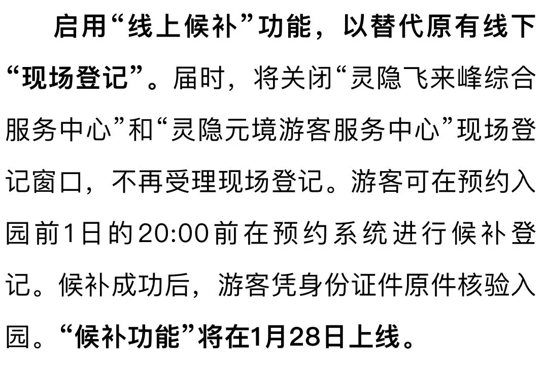 1月26日上午,“杭州西湖景区发布”公众号发文《关于优化杭州灵隐飞来峰景区预约机制的通告》,内容中提到:2026年2月1日起,对灵隐飞来峰景区现行预约机制进行优化升级,启用“线上候补”功能,以替代原有线下“现场登记”。