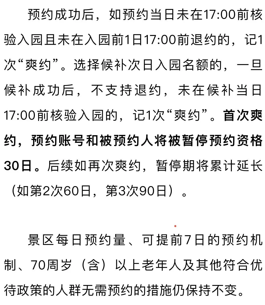 退约截止时间调整为入园前1日17:00(与每日停止入园时间一致)。系统将在每日8:00起,自动对成功预约次日待入园的订单推送“入园提醒”消息,方便游客可及时调整行程。