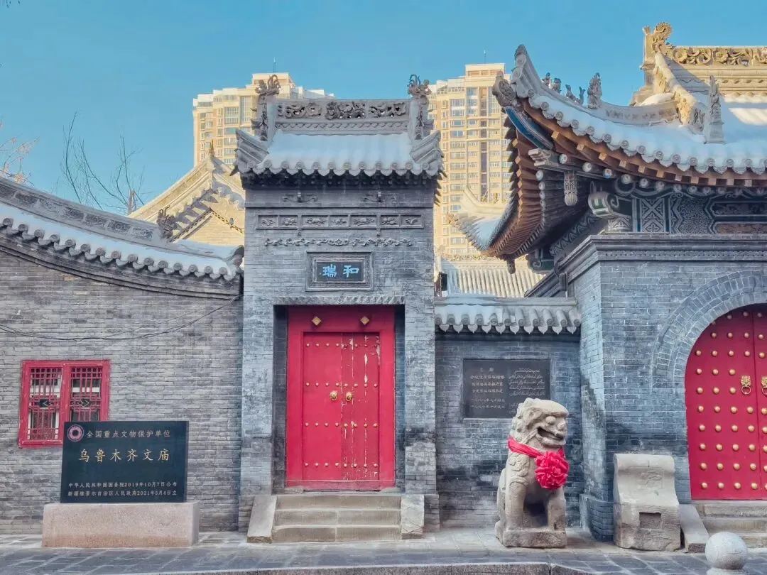 乌鲁木齐文庙,位于天山区前进路与西后街交叉路口处。这座红门青砖灰瓦的古朴建筑,与周围现代城市景观形成鲜明对比,有一种独立于喧嚣之外的清幽肃穆。