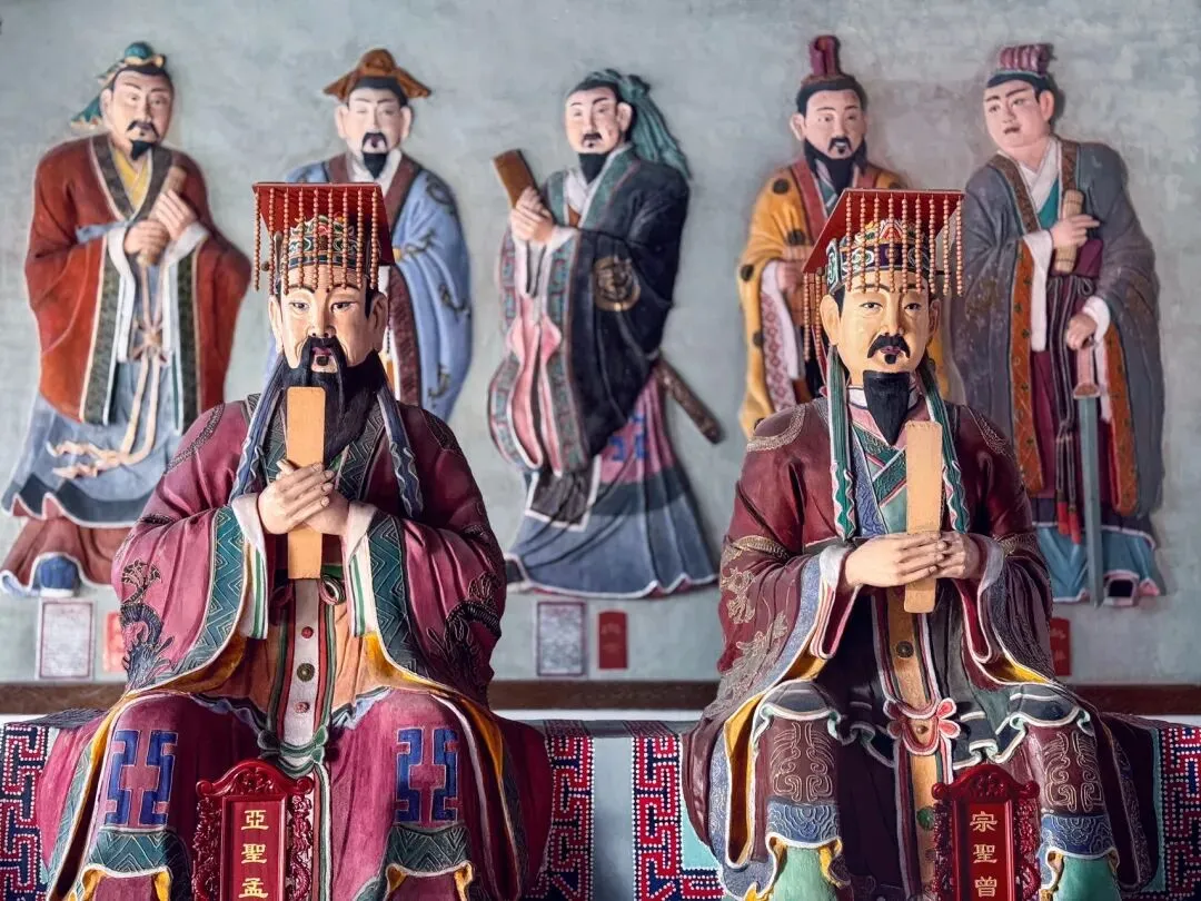 居中者即儒家学派的创始人孔子,佛龛之上悬挂着“德配天地”“万世师表”“生民未有”匾额。两侧为四圣配位,十二哲人位。