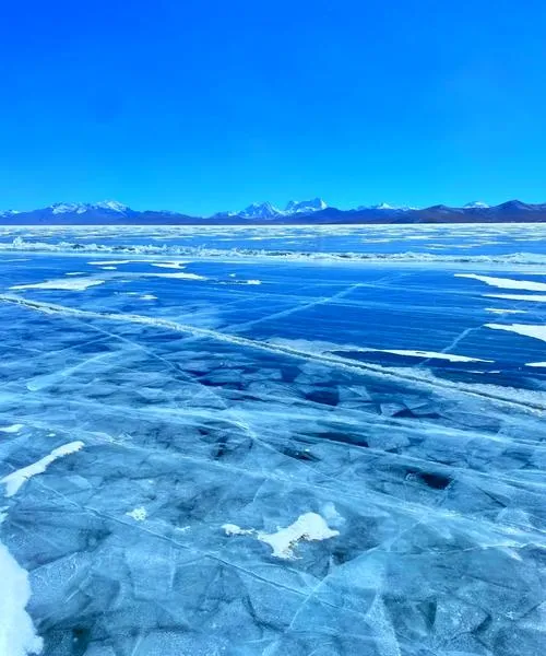 拉姆拉错是个很小的湖,但藏传佛教里地位很高,因为据说能在湖里看到前世今生,很多人去就是冲着这个传说,但你真在冬天去一趟就会明白,这个湖之所以被赋予那么多意义,不是因为它真能让你看到什么,是因为它的存在方式本身就在暗示某种东西。它在海拔5000多米的地方,周围全是雪山,湖面很小,冬天的时候边缘结冰,中间还保持着深蓝色的水面,这个画面会让你产生一种很强的心理暗示,就是在那么极端的环境里,还有个东西在保持它的流动性。