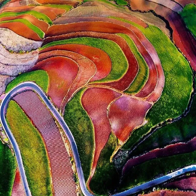 在中国,有一片赭红色的神奇土地.土壤里的铁质在千百年时间里慢慢沉淀,形成了独特的红色;加上当地人在这片贫瘠的土地上努力耕作,反而将红土地装点成了色彩绚丽的美景之地。这里就是有被誉为上帝手中的调色盒,有川穹下千彩的万花筒之称的云南东川红土地。