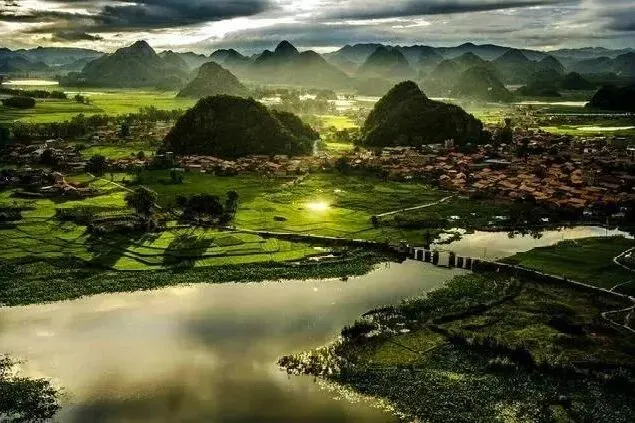 普者黑以及浓郁的民族风情而闻名,古朴而又纯净。登高远望,群山、湖水犹如盆景般秀丽精致。在这色彩中,你的眼睛和心灵被一种难以言喻的幸福感涤荡着。