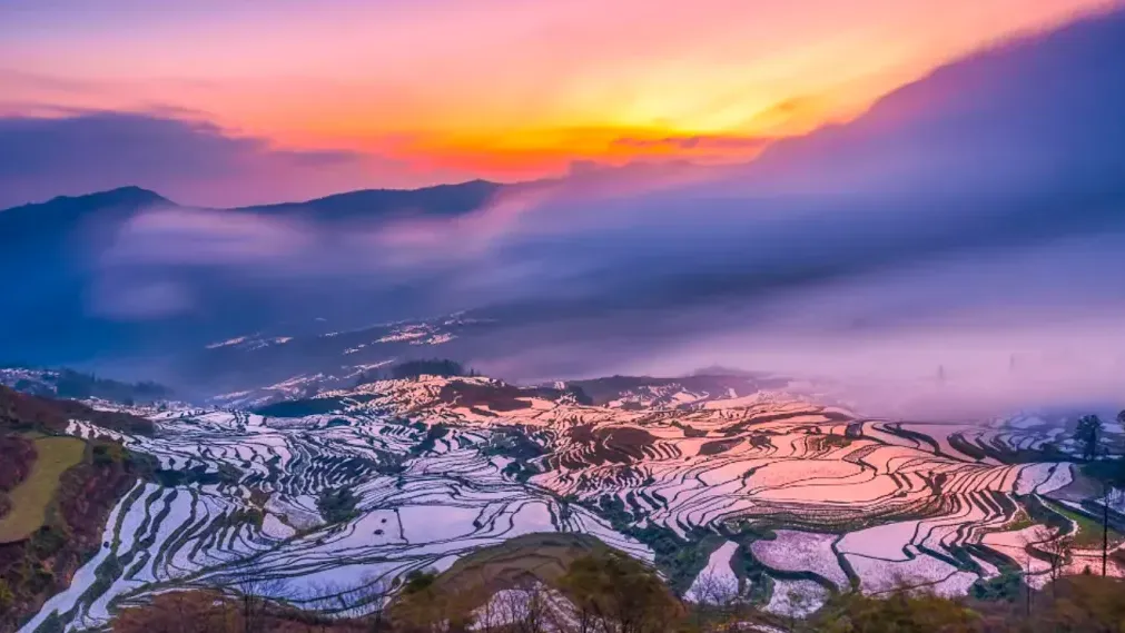 元阳梯田最美的季节是每年12月至次年3月的春耕季节,这个时候梯田放满了水,像重重叠叠的万千面镜子,倒映着蓝天青山、朝阳夕照,气势磅礴!