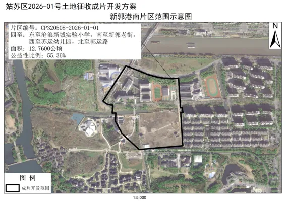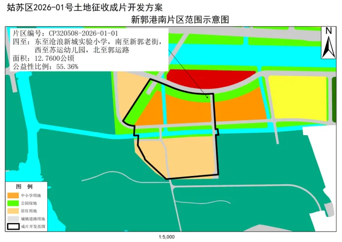 根据土地征收成片开发方案,本次征收的片区为新郭港南片区(CP320508-2026-01-01),涉及1个板块,为吴门桥街道,总面积12.76公顷。 该片区东至沧浪新城实验小学,南至新郭老街,西至苏运幼儿园,北至郭运路,详见如下——