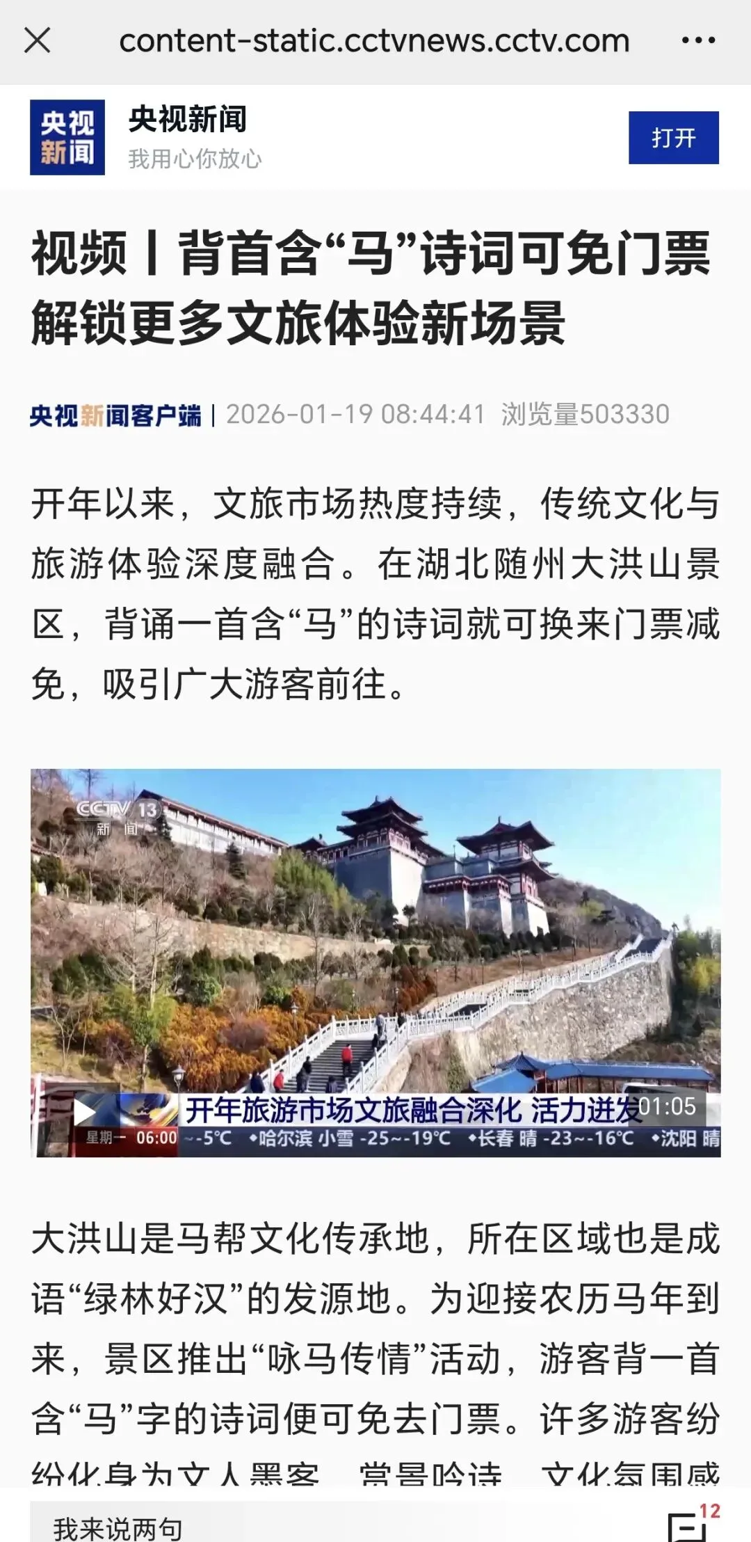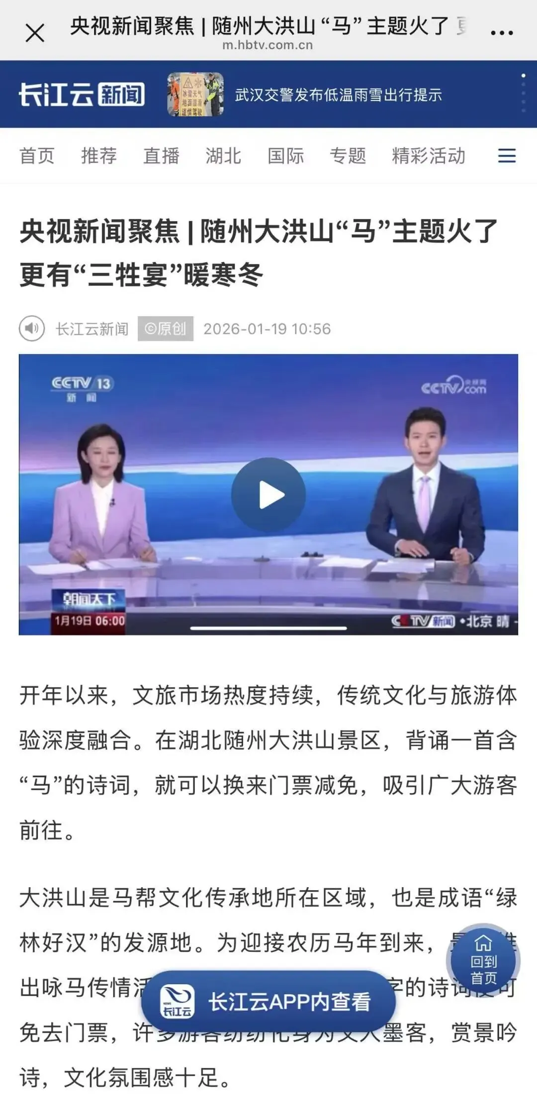 开年以来,文旅市场热度持续,传统文化与旅游体验深度融合。湖北随州大洪山景区凭借一场“马”力拉满的特色盛宴, 引得央视新闻客户端、CCTV13、《正点财经》、长江云等多家主流平台同步聚焦,用诗词雅韵与烟火温情,成为荆楚大地冬日最具人气的新春打卡地。