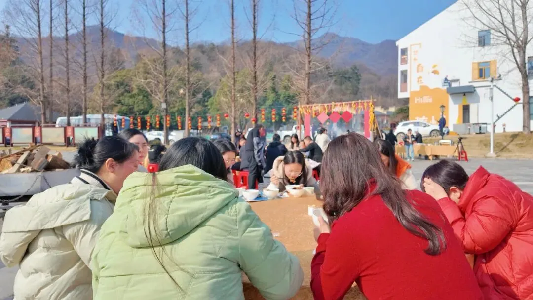 沿着盘山公路上行,抵达景区标志性景点“华中银杏第一树”。树下广场摆开“三牲宴”流水席,游客花一元钱,就能品尝大洪山自在牛、自在羊和土猪肉烹制的地道美食。欢声笑语伴着肉香,为凛冬增添了浓浓暖意。