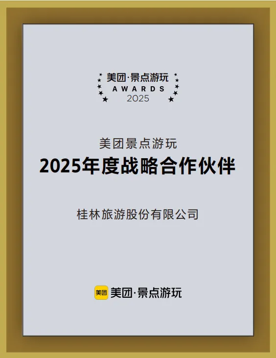 桂林旅游股份有限公司荣膺美团景点游玩“2025年度战略合作伙伴”。美团作为“互联网+文旅”领域的先行者,其评选体系严谨权威,该奖项是美团平台对桂林旅股合作价值与一城游运营的高度认可,更是广大游客用选择投下的信任票。