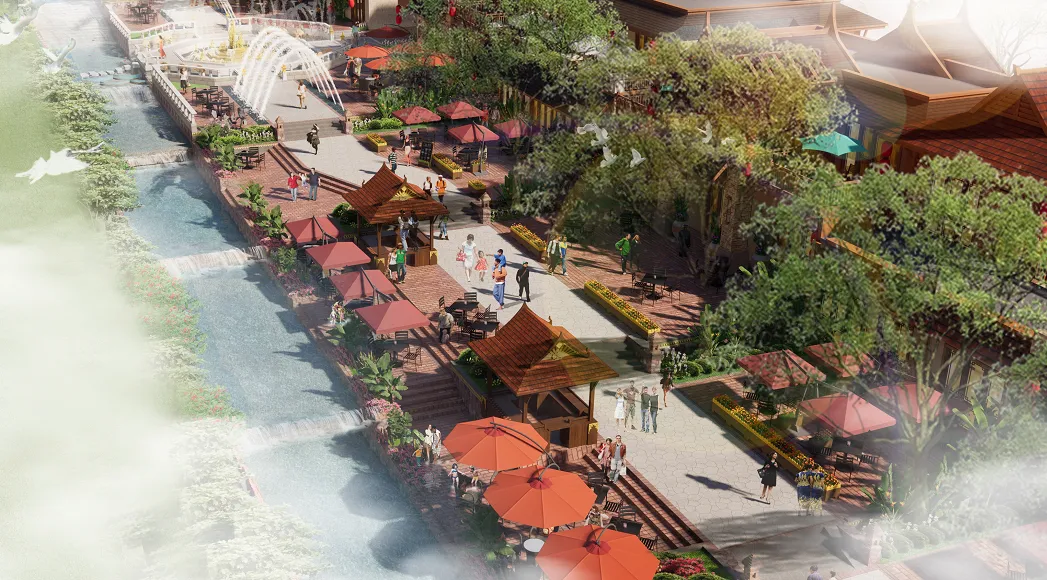 勐琵玛亚音乐广场位于女神湖东侧,用地面积约2400㎡。该区域位于两河相交区域,具有极佳的景观界面和水景打造条件。延续傣族水文化主题,利用水系资源,打造特色水秀场景,并结合广场空间、景观绿地,成为吸客、聚客的场所,形成二期夜间旅游的引擎项目。