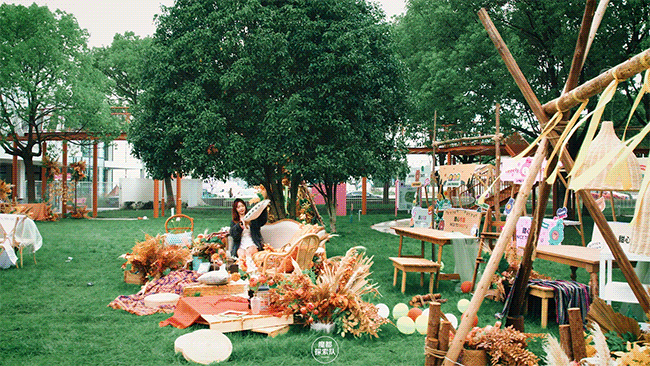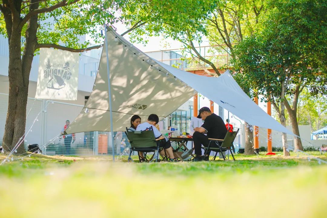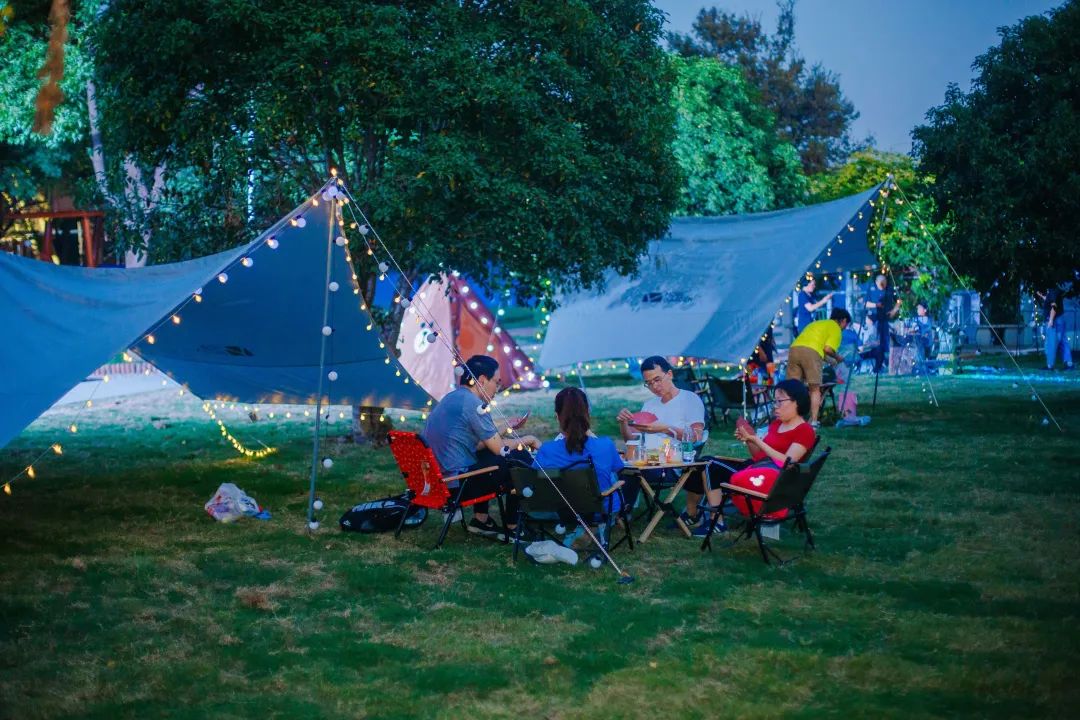 乐园当然不止这些,只看见偌大的草坪上四处散落着支起的帐篷和天幕,几个伙伴围桌而坐,谈笑风声。