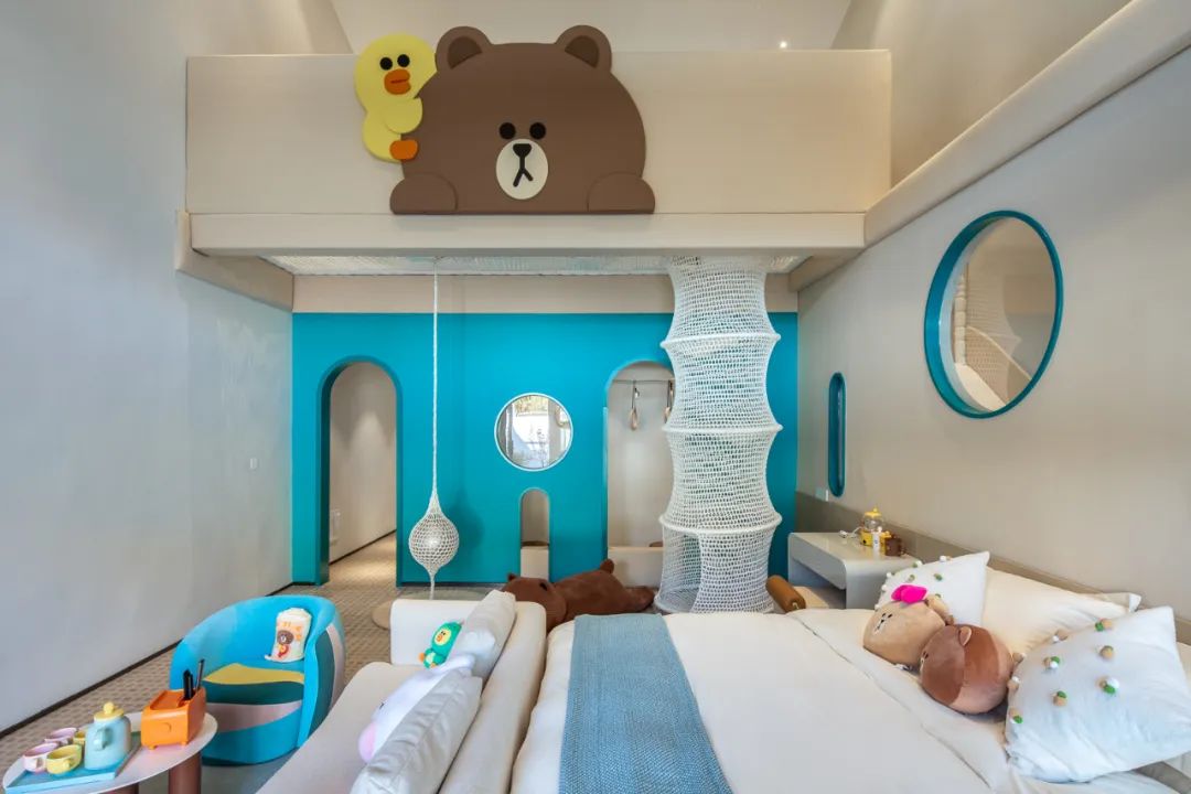 房间内的每一处几乎都被LINE FRIENDS元素填满,粉蓝色的墙面看起来更加俏皮,滑梯、绳网、黑板.....简直把乐园一起搬进布朗之家。