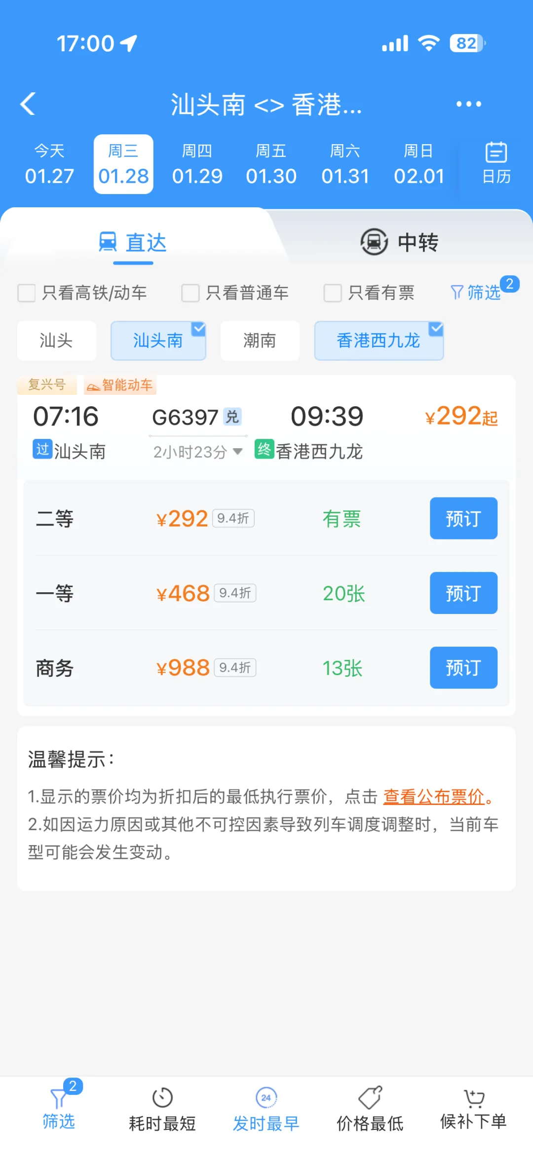✅经停站:汕头南→陆丰东→汕尾→惠州南→深圳北→香港西九龙