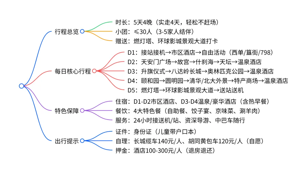 行程细节透明公开,例如故宫周一闭馆可调整顺序,D5返程时间建议,让您提前规划无忧。