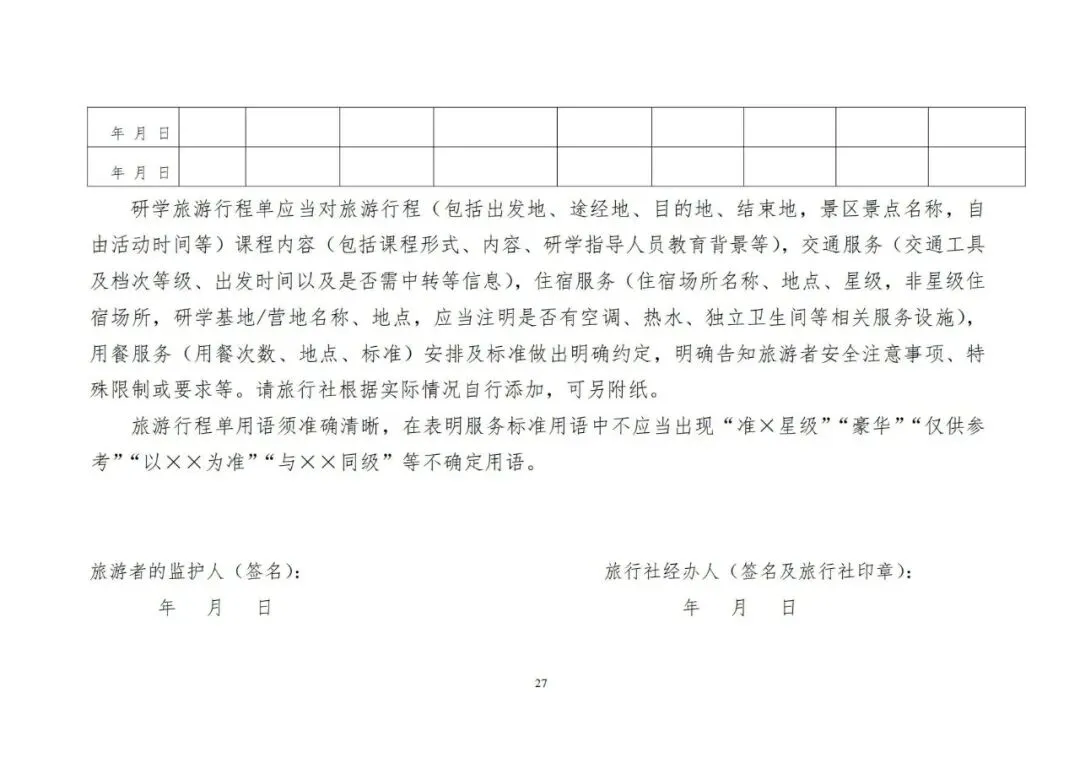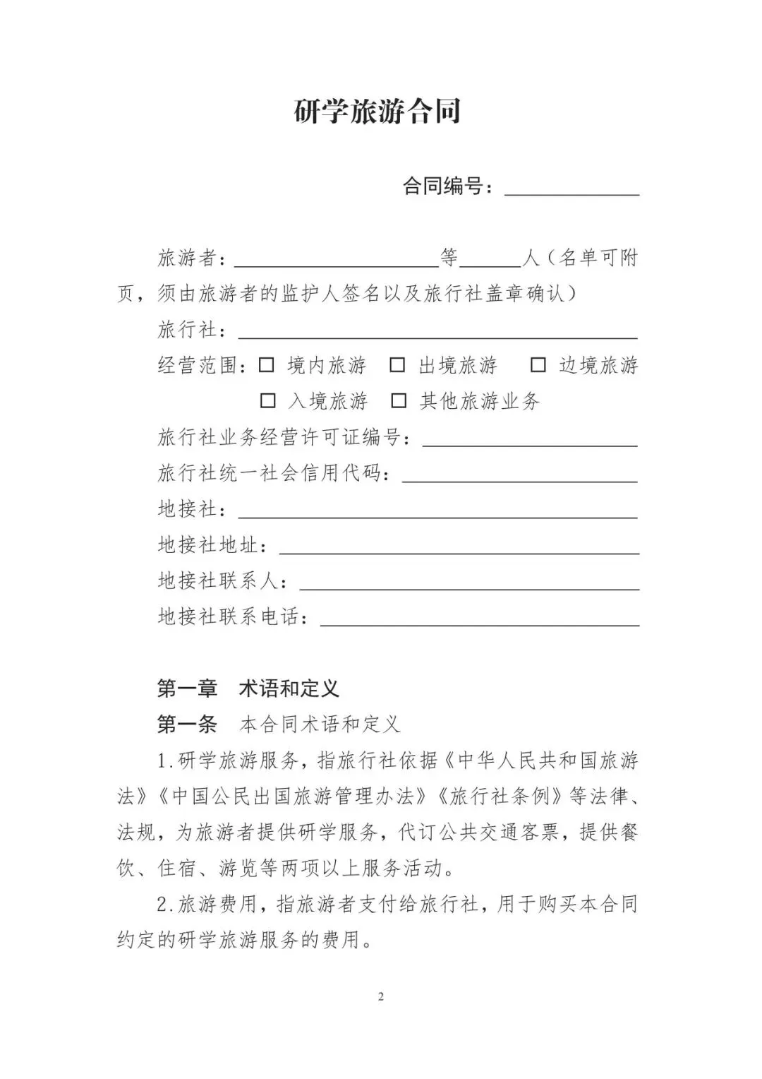 为进一步规范旅游市场秩序,提升旅游服务质量,保障旅游者和旅行社企业合法权益,文化和旅游部会同市场监管总局对现行团队旅游合同(示范文本)进行了修订,新增了《研学旅游合同(示范文本)》。