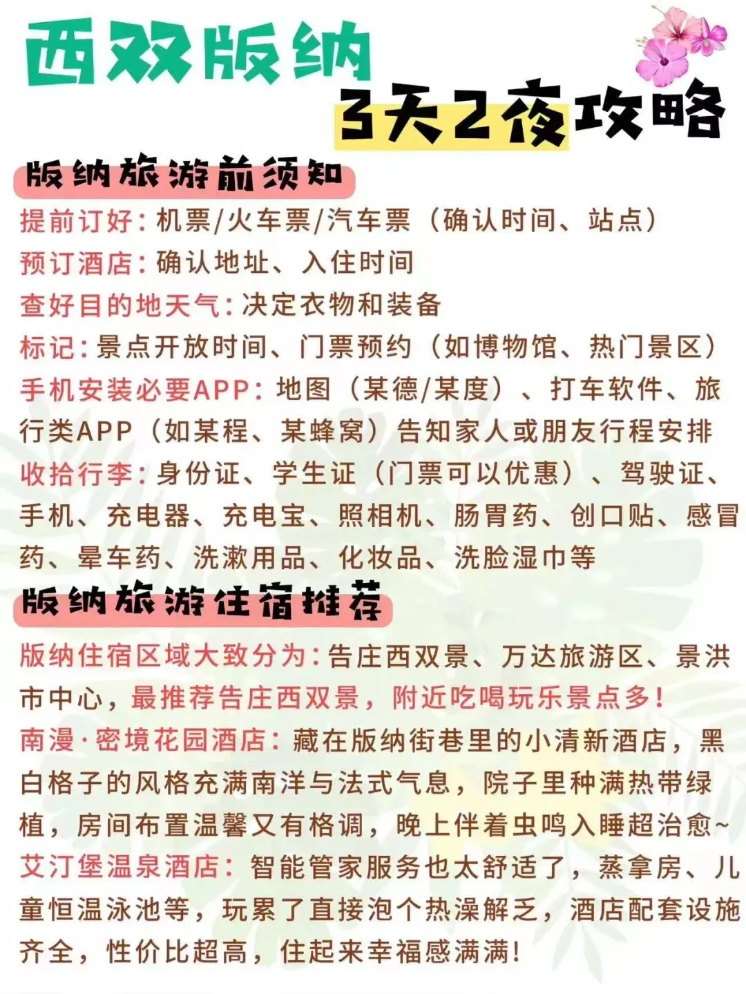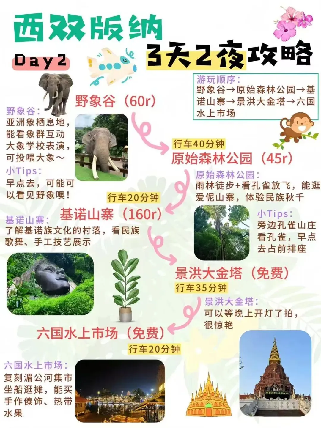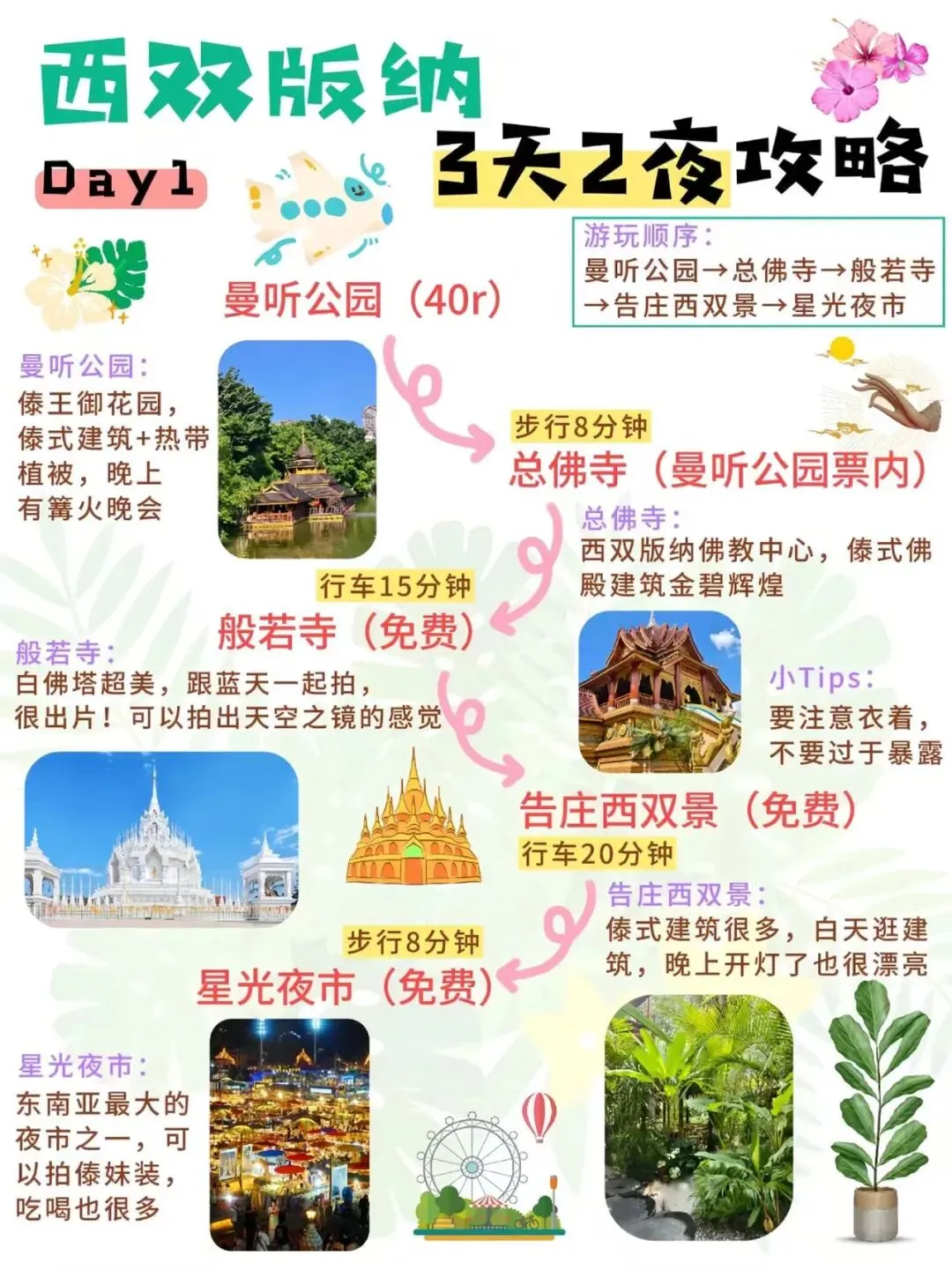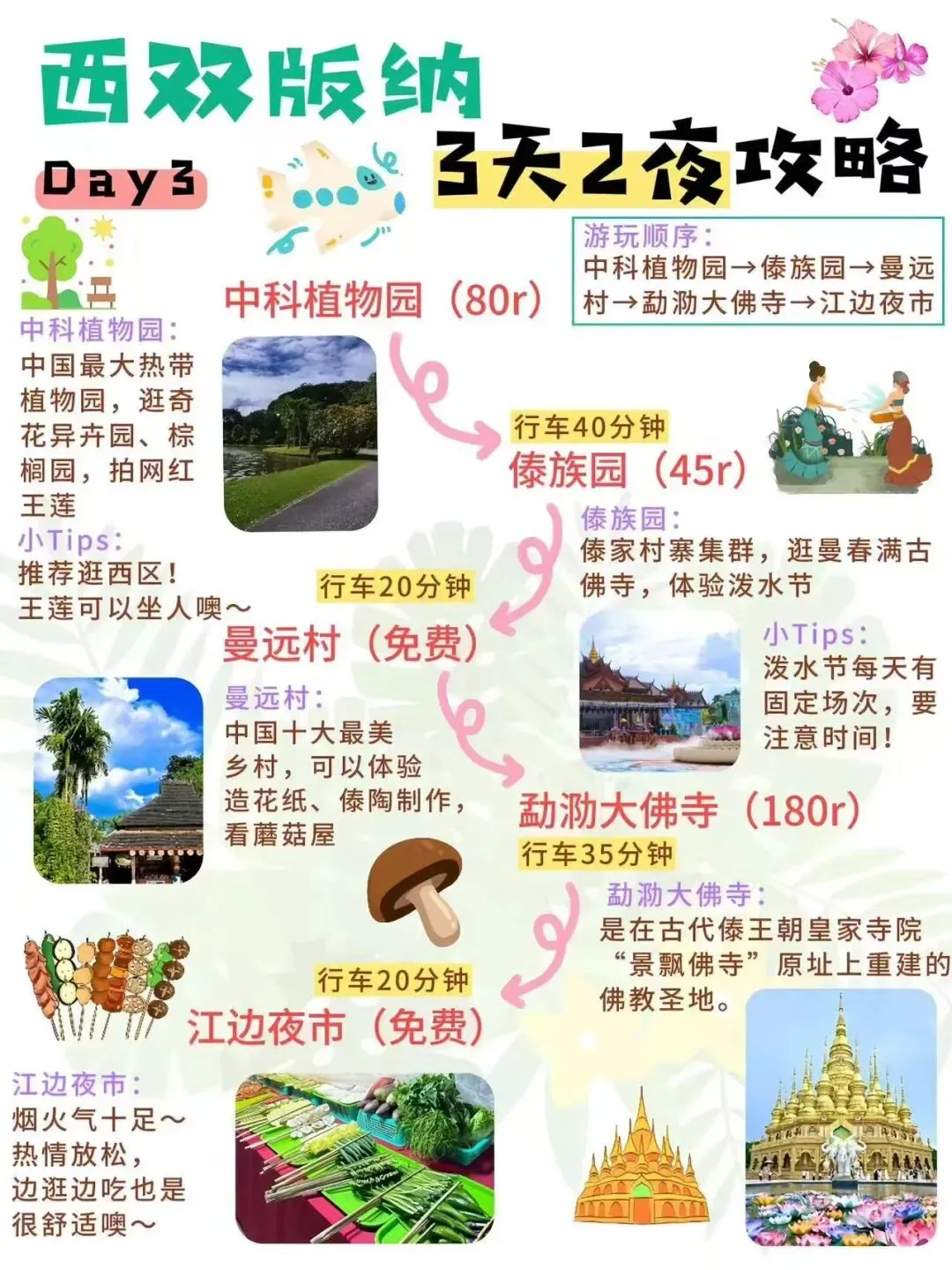西双版纳旅游攻略0127熬夜手写西双版纳攻略😭被自己感动到。准备去西双版纳玩3天,终于是把攻略做出来了!姐妹们可以直接抄作业😎 📍DAY1:曼听公园→总佛寺→般若寺→告庄西双景→星光夜市 📍DAY2:野象谷→原始森林公园→基诺山寨→景洪大金塔→六国水上市场 📍DAY3:中科植物园→傣族园→曼远村→勐泐大佛寺→江边夜市 ‼️如果是一个人去西双版纳玩,避免到远处,不要进入原始森林,不要和陌生奇怪的人讲话,城区是安全的,结伴出行! ‼️去雨林一定要穿长衣长裤,喷再多驱蚊液都没用可以在夜市买一条系腰带的扎腿裤,透气还防虫 ‼️星光夜市可以吃吃逛逛,拍写真,但不建议花高价购买 #西双版纳旅游攻略#西双版纳游玩攻略#西双版纳美食#西双版纳住宿酒店#西双版纳住哪里