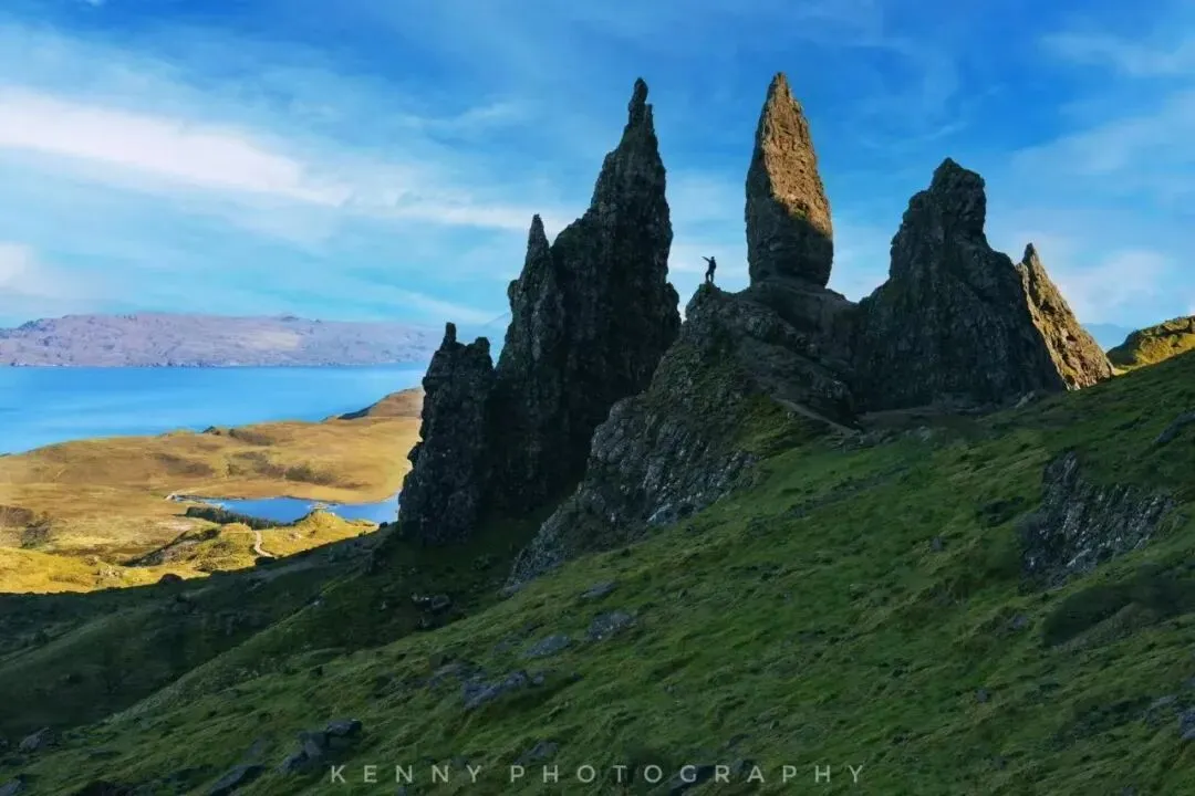 苏格兰高地的灵魂在天空岛,天空岛的标志则是老人峰Old man of storr,在逆光中我爬上了岩石与山峰同框自拍。