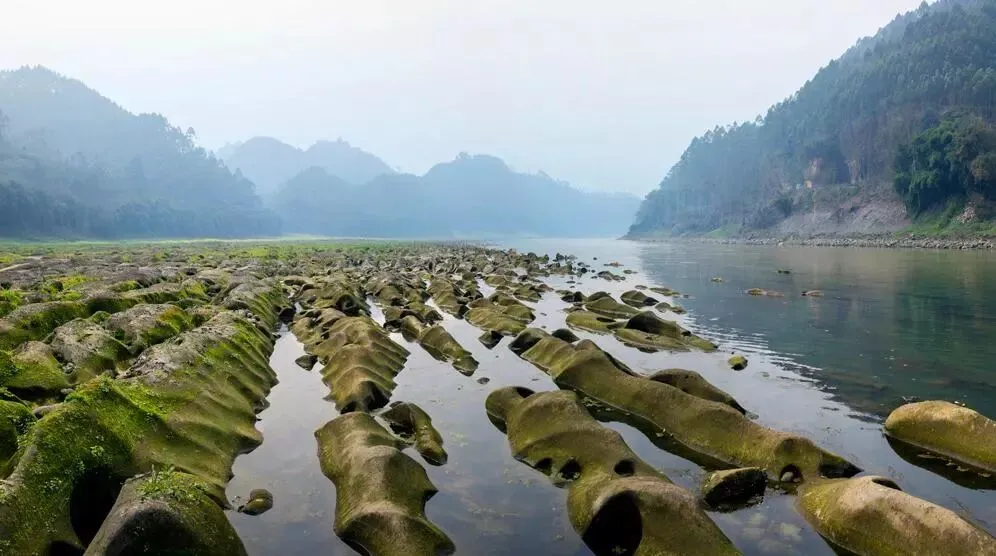 泛舟平羌峡段,河边右岸大片嶙峋怪石,像一大群鸭子在河中戏游,其景蔚为壮观。