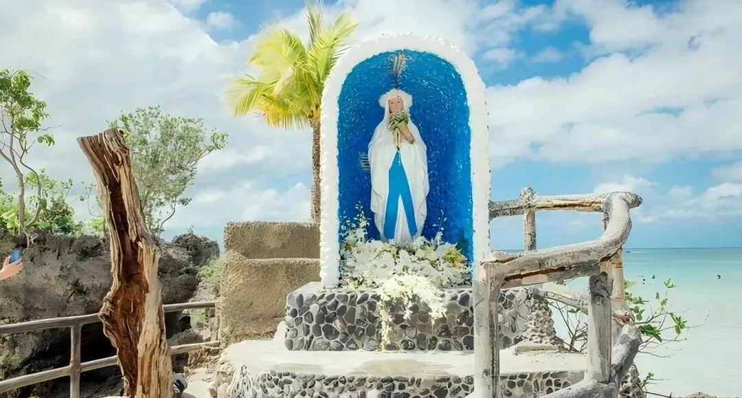白沙滩边的地标性礁石,顶部有一座迷你圣母像,退潮时可步行靠近。适合拍照打卡,尤其推荐日出时分的剪影效果!。