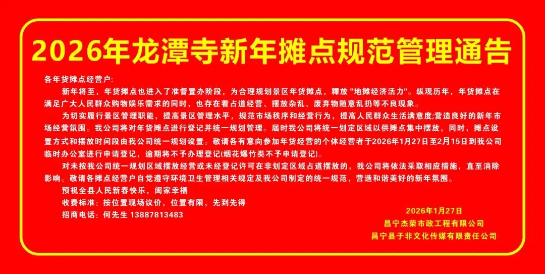 庙会现面向社会公开进行摊位招租!欢迎有意商家积极报名,为景区游客提供特色小吃、手工艺品、春节纪念品零食、书法、茶艺及游艺娱乐等各类具有文化特色的产品、项目及服务。