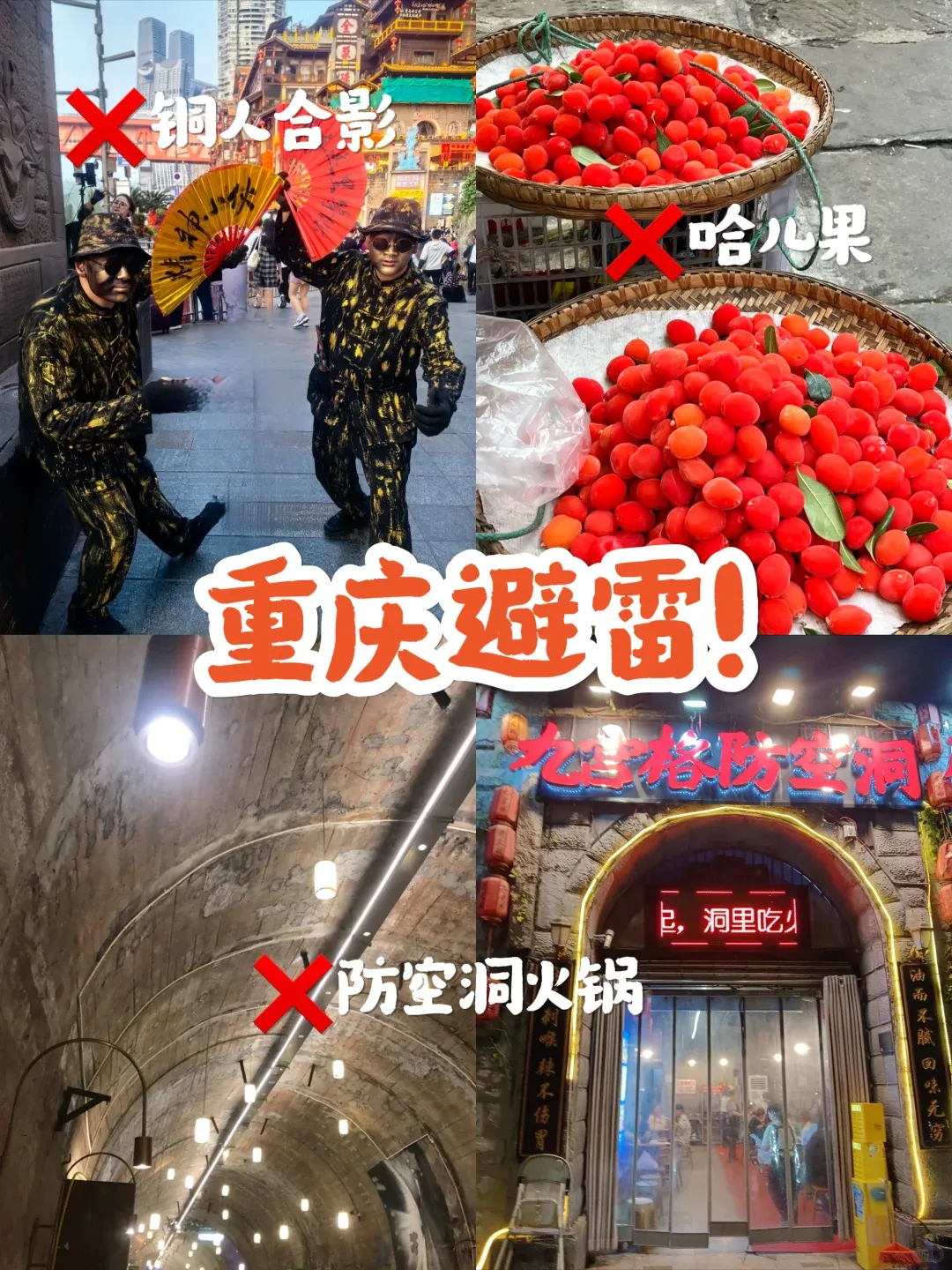 ‼避雷‼ ❌ 路边红心果重庆人俗称哈儿果,又贵又难吃,想被骗的有福了 ❌ 名字里面有“防空洞”“社区”“什么孃孃姐姐妈”的火锅都不要去 ❌ 解放碑/洪崖洞的“铜人”合照,要收费
