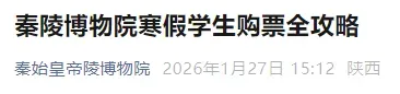 1月27日,秦始皇帝陵博物院发布通知称,寒假即将来临,为方便广大学生及家长规划行程,特地奉上这份学生购票全攻略↓↓↓