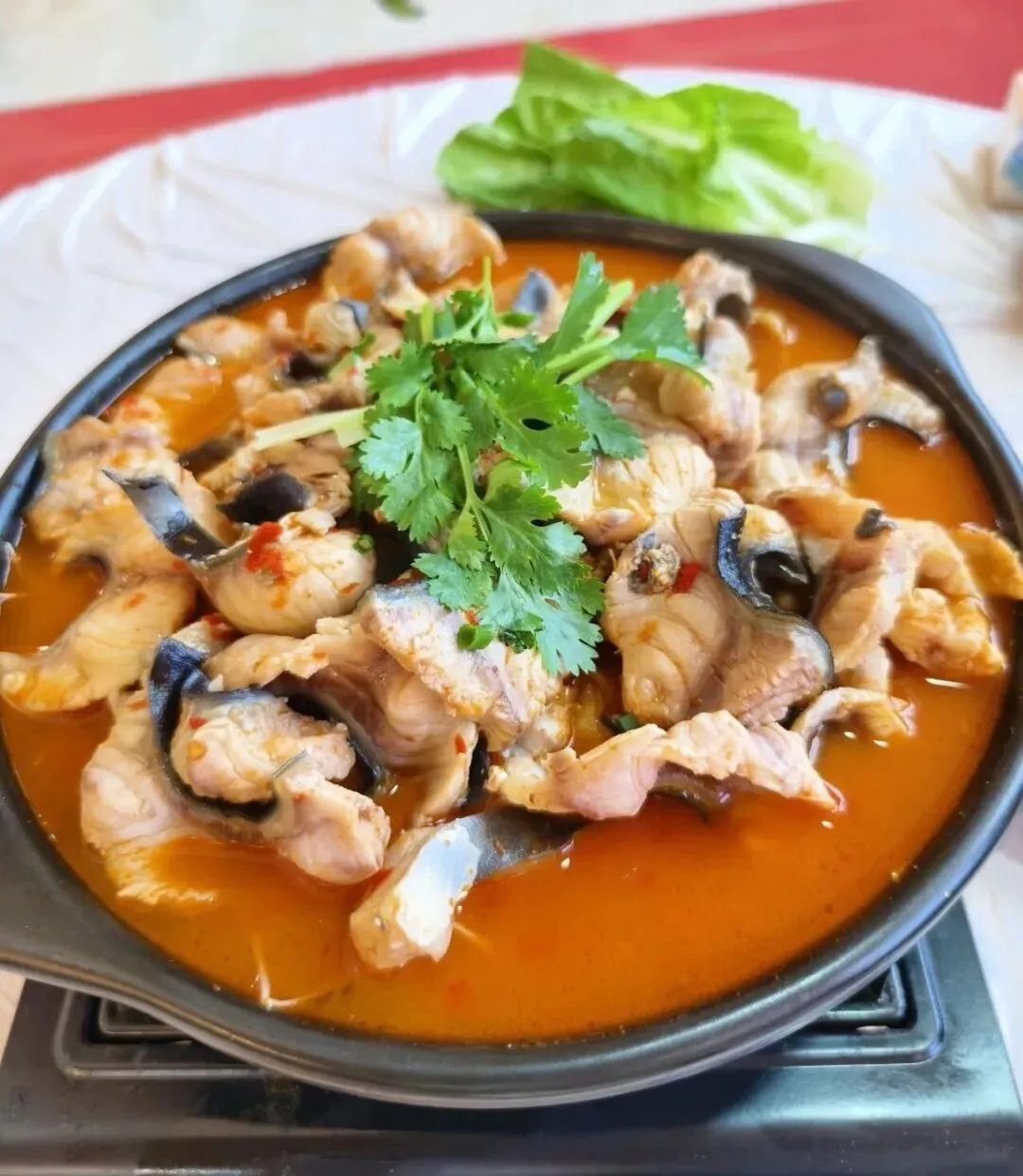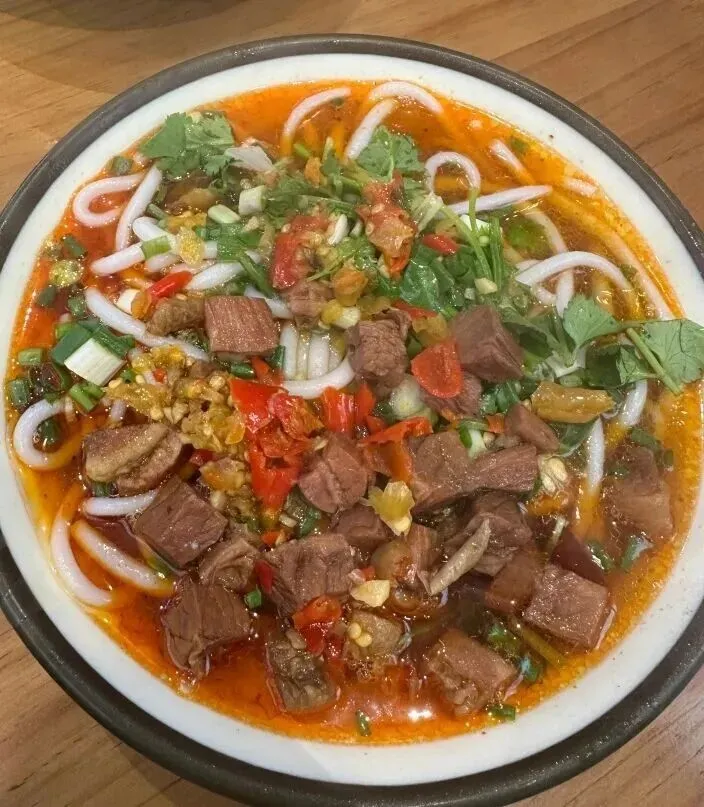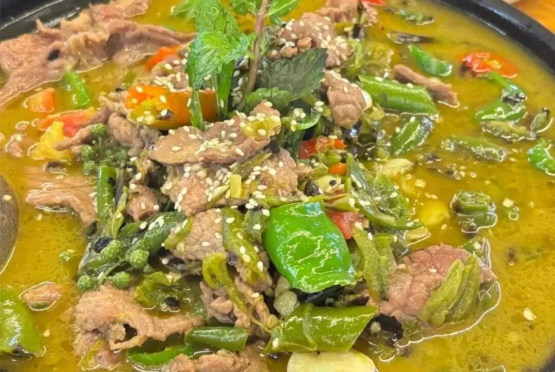 酸汤牛肉:镇远酸汤系列的灵魂硬菜!选用本地传统发酵的红酸汤(以野生毛辣果、红辣椒古法酿造),搭配纹理均匀的牛上脑或牛眼肉,肉片薄嫩入味,在酸汤中涮煮后吸饱酸辣精华。入口先是醇厚酸香,后带一丝鲜辣回甘,木姜子的独特香气萦绕舌尖,暖心又开胃。推荐苗伯妈酸汤、黔一刀,店家还会搭配辣椒面+鱼骨粉特制蘸料,层次感直接拉满,酸汤泡饭更是一绝!