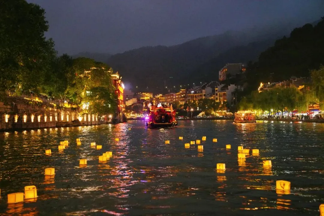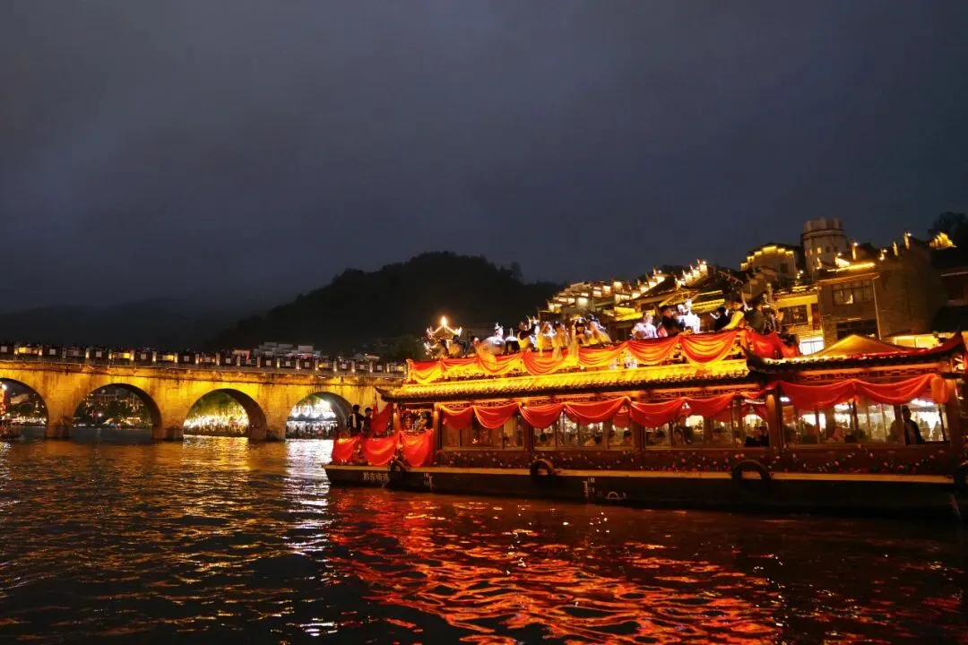 晚上:夜赏㵲阳河乘画舫夜游㵲阳河,看两岸古建筑在灯光映衬下焕发光彩,红灯笼倒映水中,波光粼粼间尽显古城温柔夜色。