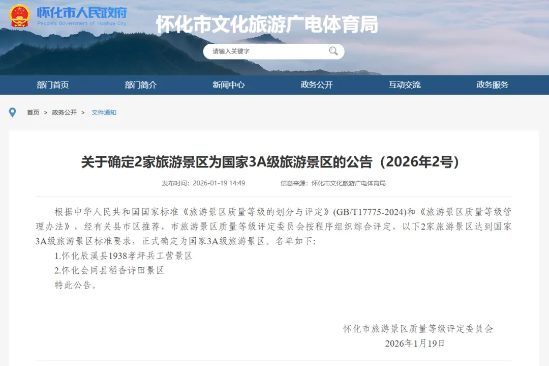 2026年1月19日,怀化市旅游景区质量等级评定委员会发布公告,辰溪县1938孝坪兵工营景区、会同县稻香诗田景区被正式确定为国家3A级旅游景区。