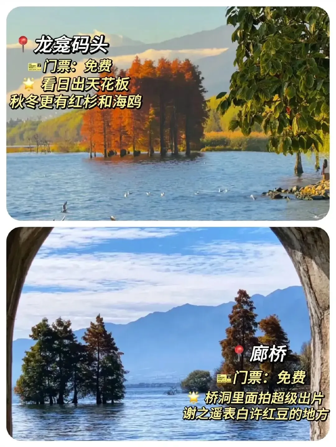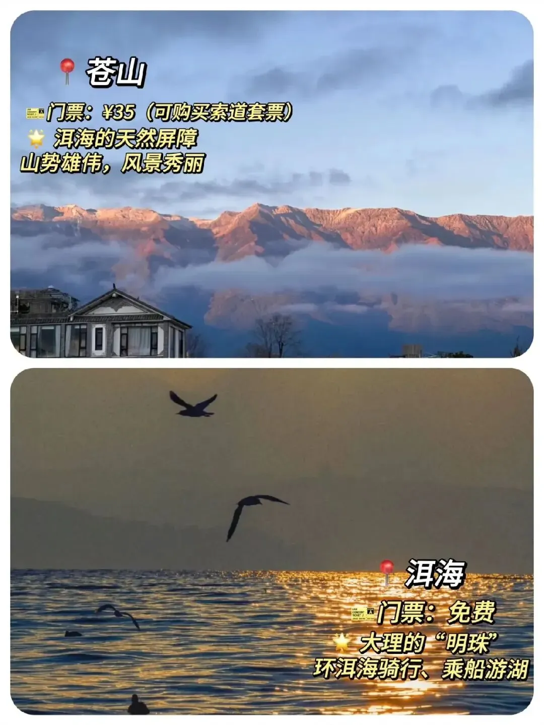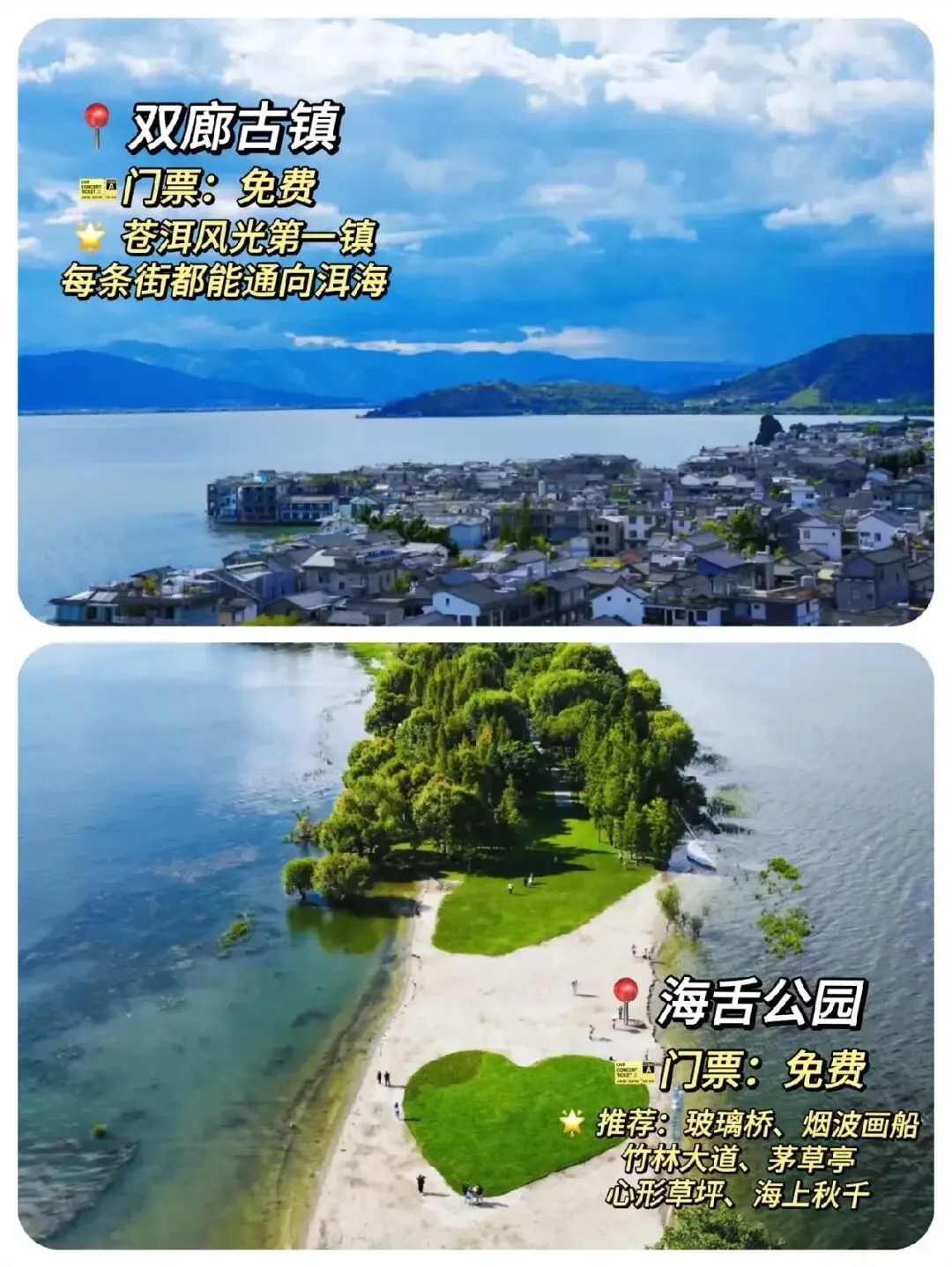 :免费,大理的 “蓝色明珠”,环海骑行、乘船游湖,看日出日落与海鸥共舞,氛围感拉满。