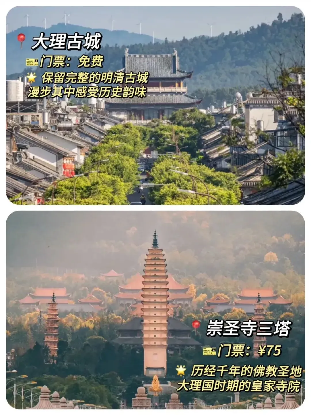 :免费,保留完整的明清古城,青石板路、白族民居,漫步其中感受历史韵味,夜晚的古城更有烟火气。 - 崇圣寺三塔