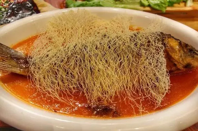 鲤鱼焙面与慈禧太后有很大的渊源,是开封市的传统菜肴。妙在一道菜肴,两种食趣:将细如发丝的拉面油炸后和熘鱼搭配起来。
