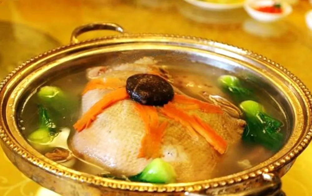 汤盆中间是首尾完整的全鸭,吃完酥软的鸭肉,露出一只清香全鸡,鸡肉吃完,味道鲜美的全鸽又呈现在人们面前。