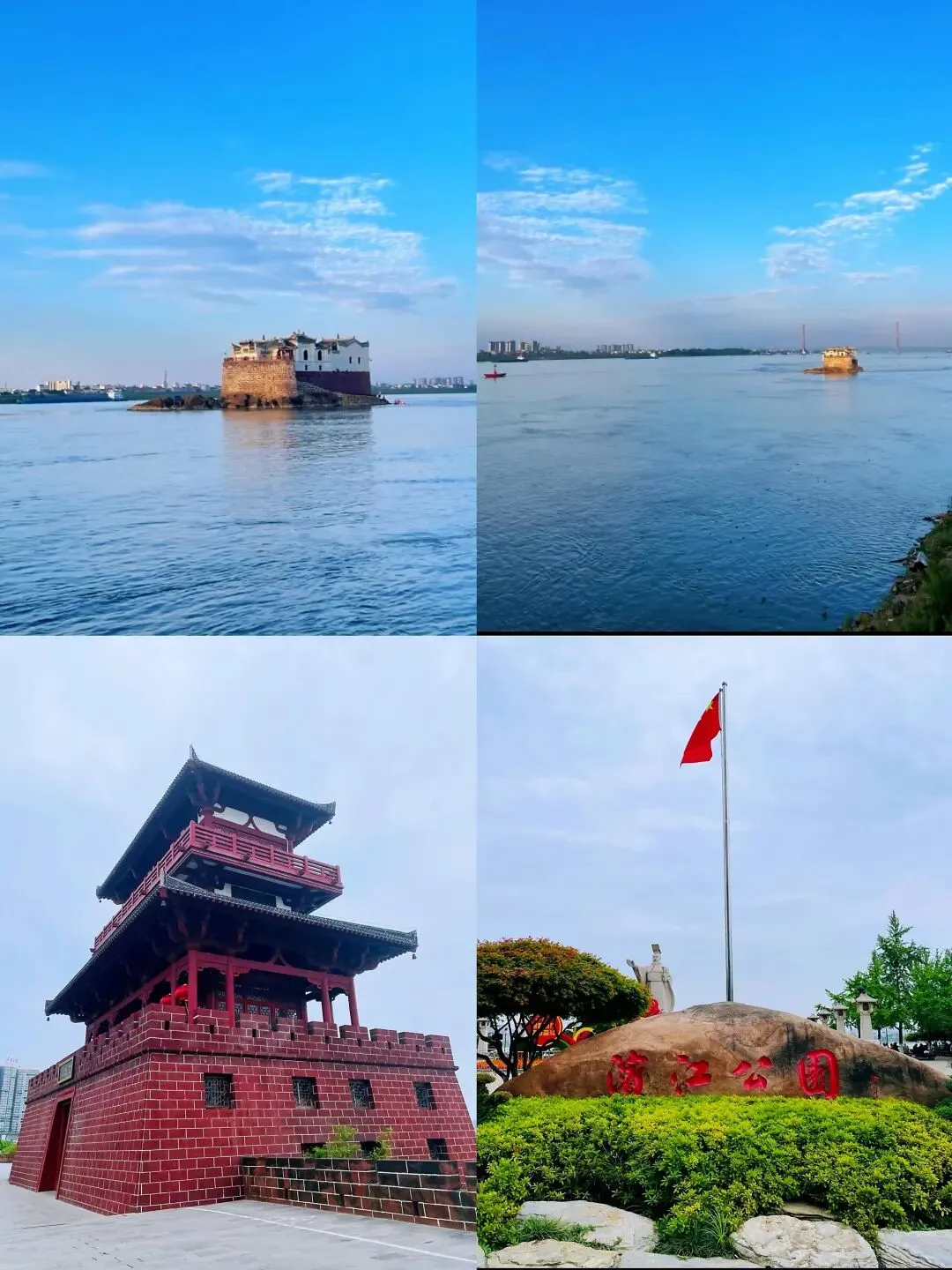 免费的江滩公园,狭长的步道沿着长江铺开。最绝的是远远就能看到观音阁,矗立在江水中,满是历史的沧桑感。江边还有孙权的雕像,随手拍都是大片。