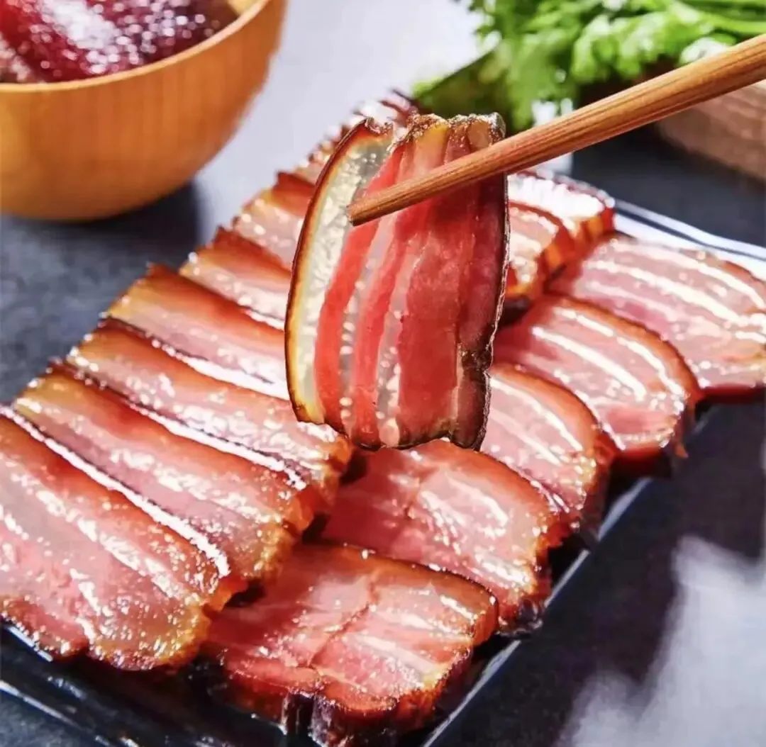 3、土家腊肉:选用本地黑猪五花肉,以松柏枝熏制,肥而不腻,切片后透明晶莹。可炒蒜苔、青椒或搭配鲊广椒。