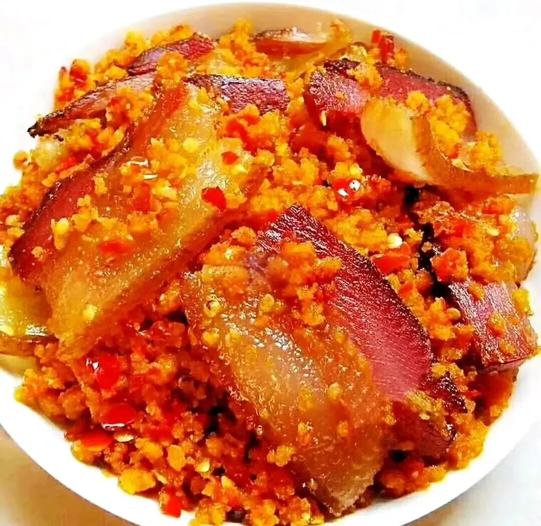 5、鲊广椒炒腊肉:鲊广椒(玉米面发酵辣椒)酸辣开胃,与腊肉同炒,口感层次丰富,是土家餐桌的“灵魂CP”。