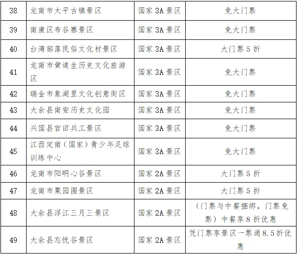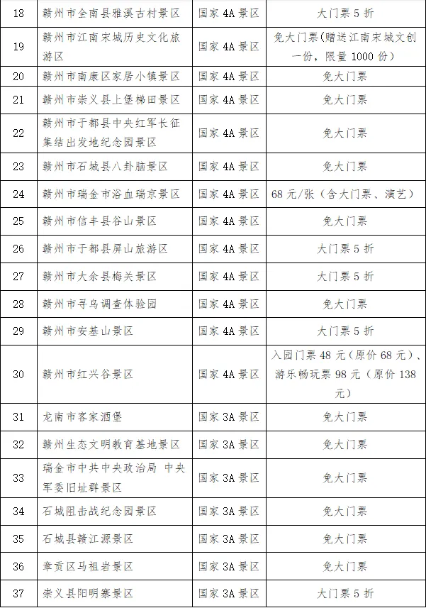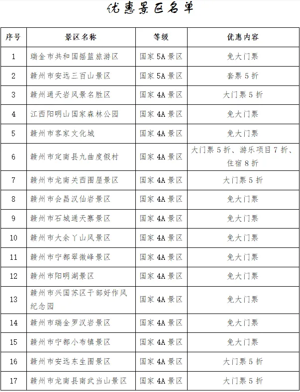 赣州市免票景区名单