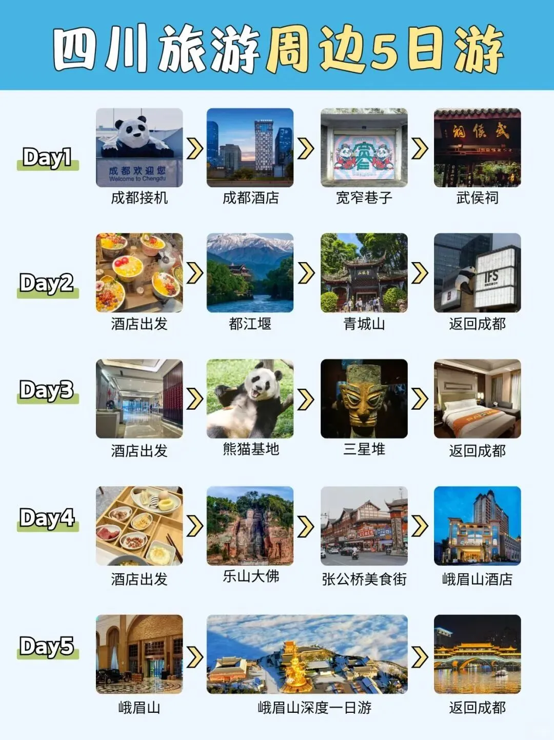 🚗.旅.行Tips:九寨.沟海拔.较高,行.动放缓,.备好常用药。成都美.食麻辣,可选择鸳鸯锅。