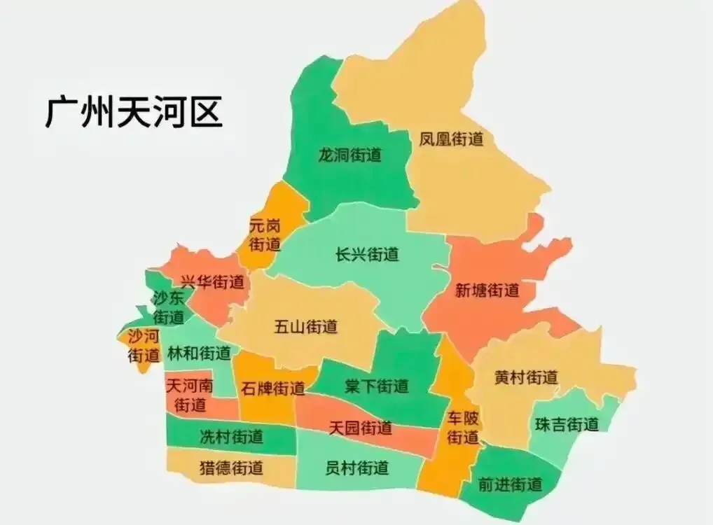 天河区辖21个街道:沙河街道、五山街道、员村街道、车陂街道、石牌街道、天河南街道、林和街道、沙东街道、兴华街道、棠下街道、天园街道、冼村街道、猎德街道、元岗街道、黄村街道、龙洞街道、长兴街道、凤凰街道、前进街道、珠吉街道、新塘街道。区政府驻天园街道天府路。