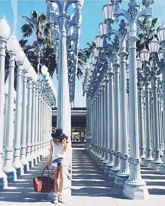 城市之光灯柱位于LACMA洛杉矶艺术博物馆门前,你能在这一排排浅灰色罗马灯柱间看到各种拍照的人们。错综有致的背景能带来很多拍照灵感,你可以选择上午阳光照射时或傍晚灯柱点亮时前来打卡,都是不同风格哦。