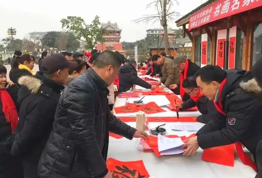 过年怎么能少了贴春联、贴福字?2月3日、2月7日,省内知名书法家在洛带古镇五凤楼广场、土楼广场,向现场游客赠送现场手书春联、书画、“福”字等丹青祝福礼。
