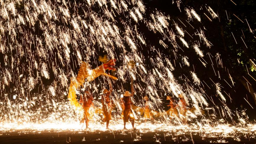今年除夕,天府国际会议中心礼仪广场将上演一场震撼人心的绝技演出——非遗火龙铁花秀。今年已经70岁的铜梁火龙非遗传承人李诗敏,将领衔9条长18米的火龙灵动地穿梭在漫天铁花之中,呈现“人在火中舞,龙在火中飞”的绝美景象。