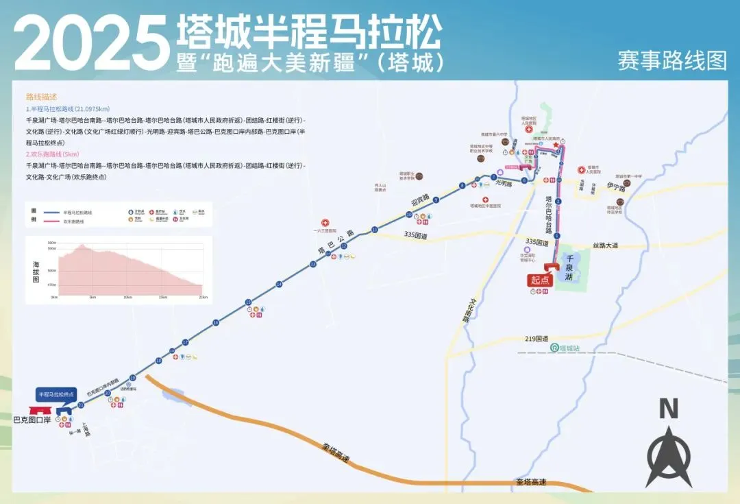 千泉湖广场(起点)-塔尔巴哈台南路--塔尔巴哈台路-塔尔巴哈台路(塔城市人民政府折返)-团结路-红楼街(逆行)-文化路(逆行)-文化路(文化广场红绿灯顺行)-光明路-迎宾路-塔巴公路-巴克图口岸内部路-巴克图口岸(半程马拉松终点)