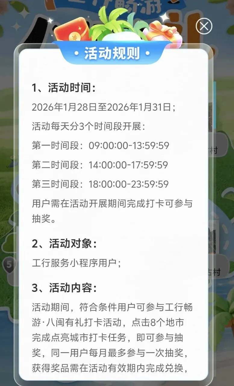 工行点亮景点打卡领微信立减金,活动时间到1月31日,每天9点,14点,18点准点去,每人只能领一次!领到就是1元,温馨提示,现在画面非常卡,你们等14点那一场再去,小编刚刚就是很卡硬等,还点亮了,然后抽奖显示这个场次奖品已抢完,导致抽奖机会没有了,痛失1元,你们别重蹈覆辙,已经给你们试错一次了。