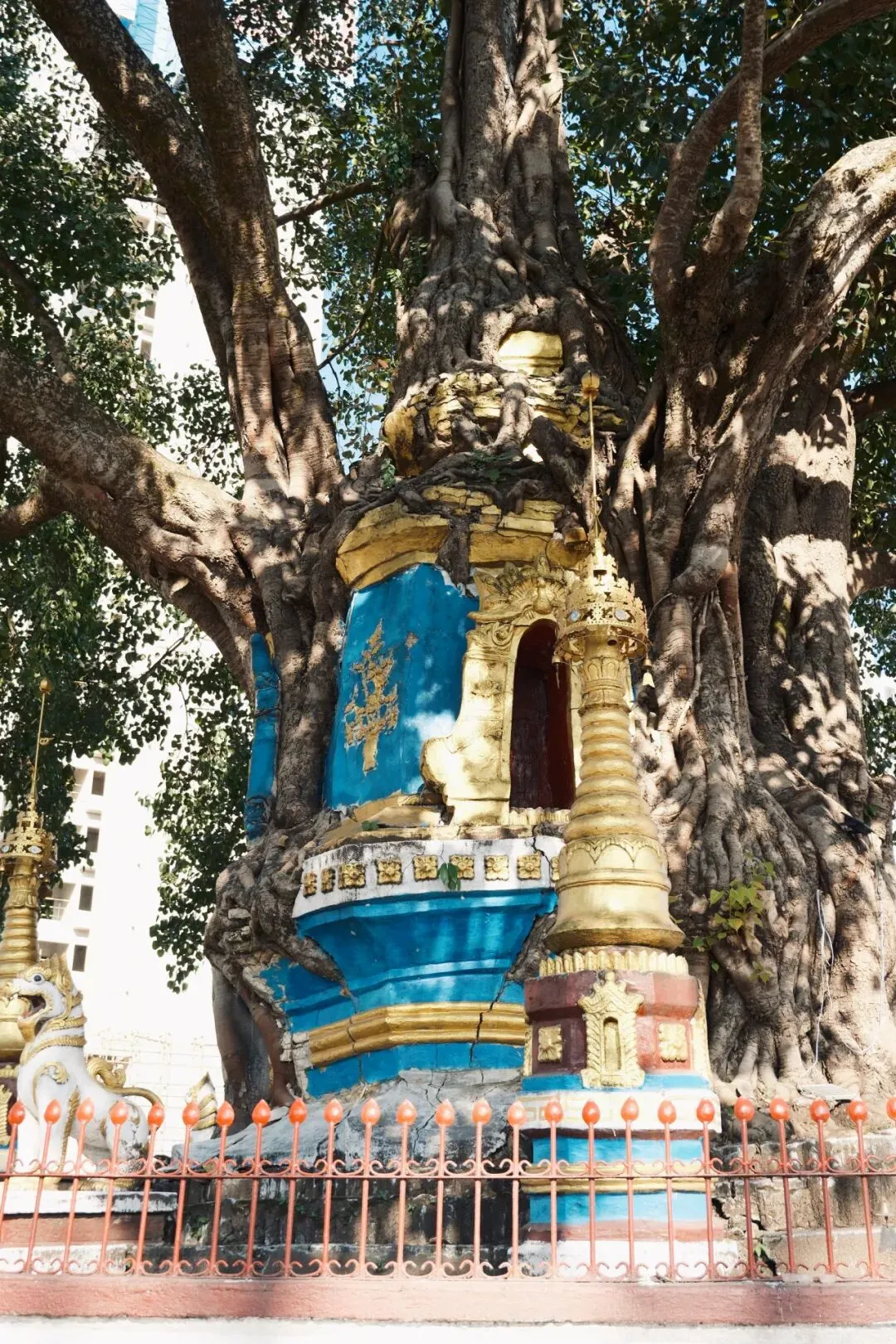傣语称“广母姐列”,由芒市第十七世土司于1778年为纪念一场胜利的战争而建。主塔高约11.6米,八角形须弥座上矗立着四座小塔,神龛内供奉庄严佛像,历经岁月侵蚀,塔身裂缝中意外生长出榕树,根系逐渐包裹塔体,最终形成树高30余米、树冠覆盖近1000平方米的共生奇观。