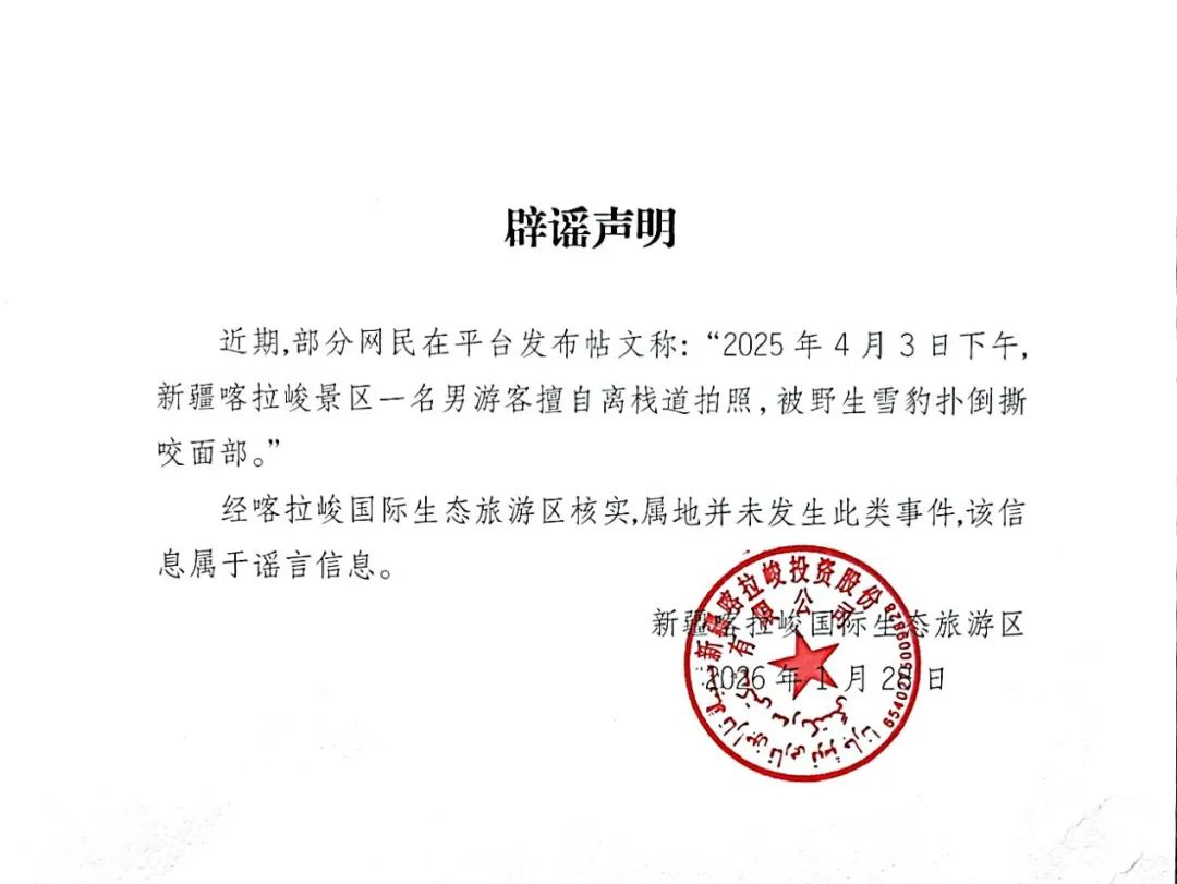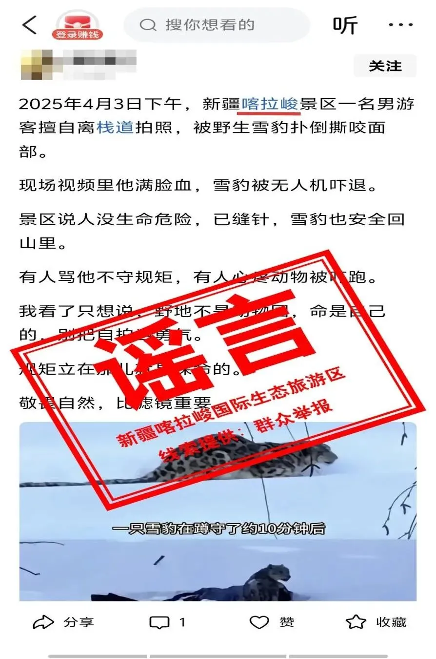 近期,部分网民在平台发布帖文称:“2025年4月3日下午,新疆喀拉峻景区一名男游客擅自离栈道拍照,被野生雪豹扑倒撕咬面部。”经喀拉峻国际生态旅游区核实,属地并未发生此类事件,该信息属于谣言信息。