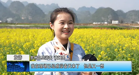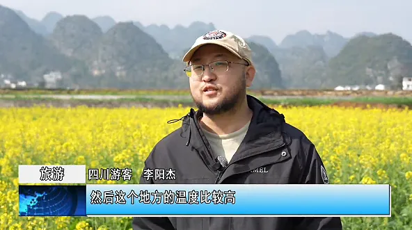 四川游客李阳杰说:“兴义的口碑就特别好。这个季节其他地方都很冷,然后这个地方的温度比较高,现在已经有油菜花开了,然后(看到)蜜蜂在那里面采蜜,然后就特别地悠闲。背景是一层一层的山,它逐渐地就像一幅水墨画一样有层次地晕开。整个环境就会感觉让你可以很放松。”